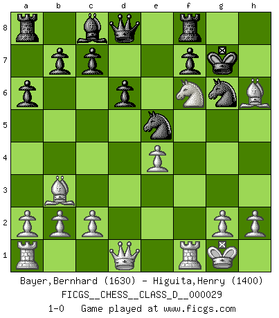 Last move : 1-0 2007 March 12 18:39:4 [Event "FICGS__CHESS__CLASS_D__000029"] [Site "FICGS"] [Date "2007.02.01"] [Round "1"] [White "Bayer,Bernhard"] [Black "Higuita,Henry"] [Result "1-0"] [WhiteElo "1630"] [BlackElo "1400"] 1.e4 e5 2.Nf3 Nc6 3.Bb5 Nge7 4.O-O a6 5.Bc4 h6 6.d4 exd4 7.Nxd4 Ne5 8.Bb3 d6 9.Nc3 N7c6 10.Nd5 Be7 11.f4 Ng6 12.Nf5 O-O 13.Nxh6+ gxh6 14.f5 Kg7 15.f6+ Bxf6 16.Nxf6 Nce5 17.Bxh6+ 1-0 Ruy Lopez : Cozio defense Kingside Castling by player White (move 4) Kingside Castling by player Black (move 12) Player White won this chess game. Follow this game move after move (download)Chess is a terrific way for kids to build self image and self esteem. (Saudin Robovic) Mein Name ist Rustam Kamsky. Sie haben meinen Sohn belästigt. Bereiten Sie sich aufs Sterben vor. (Rustam Kamsky) El Ajedrez hace al hombre ser mas sabio y ver mas claro. (Vladimir Putin) Les échecs c'est le défi de l'alpiniste, toujours plus haut, prêt à tout pour monter à l'assaut du Roi ennemi. Les échecs, c'est de la musique en mouvement, un ballet majestueux pour les yeux. C'est de la poésie composée par les fantômes du passé qui au même titre que Rimbaud ou Verlaine méritent notre admiration. Les échecs, c'est de la peinture ou le moindre mouvement modifie le tableau pour en faire un Picasso ou un Van Gogh. Les échecs, c'est tout et rien, c'est la vie et la mort. Jjulie33 sur le forum de France-Echecs. All politicians must be presumed guilty until they are proven innocent. (Dinesh De Silva)