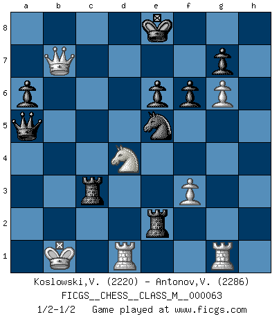 Last move : 1/2-1/2 2013 August 10 8:47:12 [Event "FICGS__CHESS__CLASS_M__000063"] [Site "FICGS"] [Date "2013.06.19"] [Round "1"] [White "Koslowski,Volker"] [Black "Antonov,Vladimir"] [Result "1/2-1/2"] [WhiteElo "2220"] [BlackElo "2286"] 1.e4 c5 2.Nf3 d6 3.d4 cxd4 4.Nxd4 Nf6 5.Nc3 a6 6.Be3 e6 7.f3 b5 8.Qd2 Nbd7 9.a3 Bb7 10.g4 h6 11.O-O-O Rc8 12.h4 d5 13.Rg1 dxe4 14.g5 hxg5 15.hxg5 Nd5 16.Nxe4 Qb6 17.g6 f6 18.Bf2 b4 19.axb4 Bxb4 20.c3 Ne5 21.Qc2 Nxc3 22.Nxc3 Bxc3 23.bxc3 Qa5 24.Qb2 Rh2 25.Qxb7 Rxc3+ 26.Kb1 Rxf2 27.Be2 Rxe2 1/2-1/2 Sicilian : Najdorf, Byrne (English) attack Queenside Castling by player White (move 11) This chess game ended in a draw. Follow this game move after move (download)Do you realize Fischer almost never has any bad pieces? He exchanges them, and the bad pieces remain with his opponents. (Yuri Balashov) Ich bin der einzige Schachspieler, der sich während der Vorbereitungen zum Turnier verletzt hat. (Woody Allen) Haz el enroque temprano y seguido. (Rob Sillars) On n'a jamais que l'âge auquel on a commence à jouer aux échecs car après on cesse de vieillir. (Capablanca) Ah, the Socrating method. The best way we have of teaching everything-apart from juggling chainsaws. (Gregory House, House M.D.)