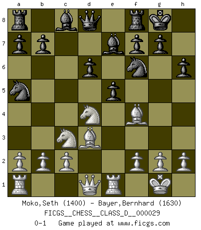 Last move : 0-1 2007 April 17 23:24:14 [Event "FICGS__CHESS__CLASS_D__000029"] [Site "FICGS"] [Date "2007.02.01"] [Round "1"] [White "Moko,Seth"] [Black "Bayer,Bernhard"] [Result "0-1"] [WhiteElo "1400"] [BlackElo "1630"] 1.e4 c5 2.Nf3 d6 3.Bc4 Nf6 4.Ng5 e6 5.O-O h6 6.Nf3 Nxe4 7.d3 Nf6 8.Nc3 Nc6 9.Bf4 Be7 10.Re1 O-O 11.d4 cxd4 12.Nxd4 Na5 13.Bd3 e5 0-1 Sicilian Kingside Castling by player White (move 5) Kingside Castling by player Black (move 10) Player Black won this chess game. Follow this game move after move (download)Castle early and often. (Rob Sillars) Ivan Sokolov treibt mich als Beifahrer an mit go Loeky go - . (Loek van Wely) El Rey es una pieza de pelea. ¡Usenlo!. (Wilhelm Steinitz) Les Echecs sont affaire de jugement sensible. Savoir quand frapper et quand esquiver. (Fischer) Drag your thoughts away from your troubles... by the ears, by the heels, or any other way you can manage it. (Mark Twain)