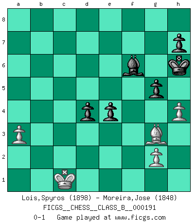 Last move : 0-1 2013 October 1 13:41:9 [Event "FICGS__CHESS__CLASS_B__000191"] [Site "FICGS"] [Date "2013.06.24"] [Round "1"] [White "Lois,Spyros"] [Black "Moreira,Jose"] [Result "0-1"] [WhiteElo "1898"] [BlackElo "1848"] 1.e4 c5 2.Nf3 d6 3.d4 cxd4 4.Nxd4 Nf6 5.Nc3 g6 6.Be2 Bg7 7.O-O Nc6 8.Be3 O-O 9.f3 d5 10.Nxc6 bxc6 11.exd5 Nxd5 12.Nxd5 cxd5 13.c3 Rb8 14.Qd2 a5 15.b3 Qd6 16.Rac1 Bf5 17.Rfd1 Rfd8 18.Bf1 e5 19.Bd3 Bxd3 20.Qxd3 Qe6 21.Bg5 Rd7 22.Be3 R7d8 23.Bf2 Rbc8 24.Qe3 Qd6 25.Qd2 f5 26.Be3 Qc6 27.Qe1 Bf8 28.Bf2 Bh6 29.Be3 Bf8 30.b4 axb4 31.cxb4 Qb7 32.a3 Ra8 33.Bf2 Bg7 34.Qc3 d4 35.Qb3+ Qd5 36.Rb1 Qxb3 37.Rxb3 Rd7 38.b5 Rb7 39.Kf1 Kf7 40.Ke2 Ra4 41.Rc1 Ke6 42.Rc6+ Kd5 43.Rc8 Bf6 44.Bg3 Rb6 45.Rc7 e4 46.Kd1 Ra5 47.Rd7+ Ke6 48.Rc7 Raxb5 49.Rxb5 Rxb5 50.Rc6+ Kf7 51.Rc7+ Kg8 52.Rc8+ Kg7 53.Rc7+ Kh6 54.h4 Rb1+ 55.Rc1 Rxc1+ 56.Kxc1 g5 57.fxe4 fxe4 0-1 Sicilian : Dragon variation Kingside Castling by player White (move 7) Kingside Castling by player Black (move 8) Player Black won this chess game. Follow this game move after move (download)Of Chess it has been said that life is not long enough for it, but that is the fault of life, not Chess. (William Ewart Napier) Schach ist eine Sache der genauen Beurteilung, wann man zuschlagen und wann man sich ducken muss. (Robert James Fischer) ¿Esta Bobby Fischer algo cuerdo?. (Salo Flohr) Vous savez, camarade Pachman, je n'éprouve pas de plaisir à être ministre, je jouerais plutôt aux échecs comme vous, ou alors ferais une révolution au Venezuela. (Che Guevara à Ludek Pachman, 'Checkmate in Prague', 1975) I teach you to lie, cheat and steal, and as soon as my back's turned you wait in line ? (Gregory House, House M.D.)