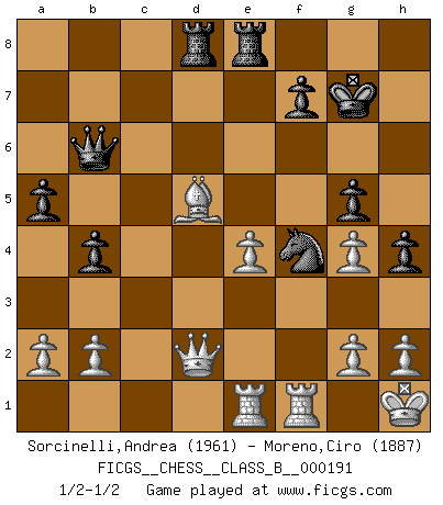 Last move : 1/2-1/2 2013 December 27 21:41:28 [Event "FICGS__CHESS__CLASS_B__000191"] [Site "FICGS"] [Date "2013.06.24"] [Round "1"] [White "Sorcinelli,Andrea"] [Black "Moreno,Ciro"] [Result "1/2-1/2"] [WhiteElo "1961"] [BlackElo "1887"] 1.d4 d5 2.c4 e6 3.Nc3 Nf6 4.cxd5 exd5 5.Bg5 c6 6.Qc2 h6 7.Bh4 Bd6 8.e3 Be6 9.Bd3 Nbd7 10.Nge2 Qe7 11.f3 c5 12.Qd2 O-O 13.O-O Rfe8 14.Bb5 g5 15.Bg3 a6 16.Bxd6 Qxd6 17.Bd3 b5 18.dxc5 Nxc5 19.Bc2 Rac8 20.Nd4 Bd7 21.Rae1 b4 22.Nce2 Qb6 23.Ng3 Ne6 24.Ndf5 h5 25.Kh1 h4 26.Nh6+ Kf8 27.Ngf5 a5 28.Ng4 Ng7 29.Nxg7 Kxg7 30.e4 Nh5 31.Bb3 Nf4 32.Bxd5 Bxg4 33.fxg4 Rcd8 1/2-1/2 QGD : Exchange, positional line, 6.Qc2 Kingside Castling by player Black (move 12) Kingside Castling by player White (move 13) This chess game ended in a draw. Follow this game move after move (download)What is the difference between chess and football? Everybody understands football, but nobody plays it. Everybody plays chess, but nobody understands it. Everything is relative. (Vladimir Kramnik) Capablanka war das größte Genie der Schachgeschichte! Aber denken sie nicht er habe nichts vom Schach verstanden. Er wusste nur soviel wie er wissen musste um seine Ziele zu erreichen. (Mikhail Moiseyevich Botvinik) En el Ajedrez, cuando menos, el valiente hereda la tierra. (Edmar Mednis) Aidez vos pièces, elles vous aideront. (Paul Morphy) Programmer - an organism that turns coffee into software. (Anonymous)