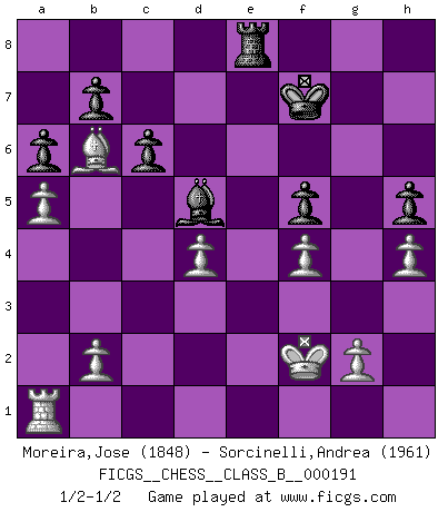 Last move : 1/2-1/2 2013 July 9 0:49:21 [Event "FICGS__CHESS__CLASS_B__000191"] [Site "FICGS"] [Date "2013.06.24"] [Round "1"] [White "Moreira,Jose"] [Black "Sorcinelli,Andrea"] [Result "1/2-1/2"] [WhiteElo "1848"] [BlackElo "1961"] 1.e4 e5 2.Nf3 Nc6 3.Bb5 a6 4.Ba4 Nf6 5.O-O Be7 6.Bxc6 dxc6 7.Re1 Bg4 8.h3 Bh5 9.d3 Nd7 10.Be3 O-O 11.Nbd2 f6 12.c3 Bf7 13.Qc2 Re8 14.Nh4 Bf8 15.Nf5 g6 16.Nh6+ Bxh6 17.Bxh6 Nc5 18.Re3 f5 19.d4 exd4 20.cxd4 Nxe4 21.Nxe4 Rxe4 22.Rxe4 fxe4 23.Qxe4 Qf6 24.Bf4 Re8 25.Be5 Qg5 26.f4 Qf5 27.Qxf5 gxf5 28.Kf2 Bd5 29.Bxc7 h5 30.a4 Kf7 31.h4 Rc8 32.Bb6 Re8 33.Bc7 Rc8 34.Bb6 Re8 35.a5 1/2-1/2 Ruy Lopez : Exchange variation doubly deferred (DERLD) Kingside Castling by player White (move 5) Kingside Castling by player Black (move 10) This chess game ended in a draw. Follow this game move after move (download)Chess holds its master in its own bonds, shackling the mind and brain so that the inner freedom of the very strongest must suffer. (Albert Einstein) Matt entspricht nicht immer den Tatsachen. (Savielly Grigorievitsch Tartakower) Preferería tener un Peón que un dedo. (Reuben Fine) Le jeu d'échecs est comme rejeté hors du temps. (Antoine de Saint-Exupéry) O divine art of subtlety and secrecy! Through you we learn to be invisible, through you inaudible and hence we can hold the enemy's fate in our hands. (Sun Tzu)