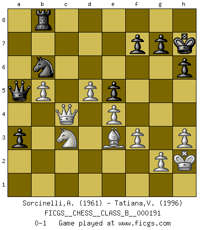 Last move : 0-1 2013 September 5 3:25:46 [Event "FICGS__CHESS__CLASS_B__000191"] [Site "FICGS"] [Date "2013.06.24"] [Round "1"] [White "Sorcinelli,Andrea"] [Black "Tatiana,Vanessa"] [Result "0-1"] [WhiteElo "1961"] [BlackElo "1996"] 1.d4 Nf6 2.c4 e6 3.Nc3 Bb4 4.Qc2 O-O 5.a3 Bxc3+ 6.Qxc3 b6 7.Bg5 Bb7 8.e3 d6 9.Ne2 Nbd7 10.Qc2 c5 11.Rd1 Qe7 12.f3 h6 13.Bh4 d5 14.Nc3 cxd4 15.Rxd4 e5 16.Rxd5 Bxd5 17.cxd5 Qd6 18.Be2 a6 19.e4 b5 20.Bf2 Rfc8 21.O-O Nb6 22.Qd2 Rab8 23.Na2 Nc4 24.Qc3 a5 25.Rc1 Nd7 26.Qb3 Nc5 27.Qc2 Na4 28.b4 Ra8 29.h3 Nab6 30.Qd1 Nxa3 31.Rxc8+ Nxc8 32.Bc5 Qd8 33.Qb3 Nc4 34.Bxc4 bxc4 35.Qxc4 Nb6 36.Qb5 Nd7 37.Be3 Kh7 38.Qd3 a4 39.Kh2 a3 40.b5 Qa5 41.Qc4 Rb8 42.Nc3 Nb6 0-1 Nimzo-Indian : Classical variation Kingside Castling by player Black (move 4) Kingside Castling by player White (move 21) Player Black won this chess game. Follow this game move after move (download)We must make sure that Chess will not be like a dead language, very interesting, but for a very small group. (Sytze Faber) Ja, jede Frau in Holland liebt mich bestimmt, und alle Männer hassen mich. (Loek van Wely) Solo existe una cosa que Fischer hace en el Ajedrez sin placer: ¡perder!. (Boris Spassky) Mais n'est-ce pas déjà le limiter injurieusement que d'appeler les échecs un jeu? N'est-ce pas aussi une science, un art, ou quelque chose qui, comme le cercueil de Mahomet entre ciel et terre, est suspendu entre l'un et l'autre, et qui réunit un nombre incroyable de contraires ? (Stefan Zweig) A computer lets you make more mistakes faster than any invention in human history - with the possible exceptions of handguns and tequila. (Mitch Ratcliffe)
