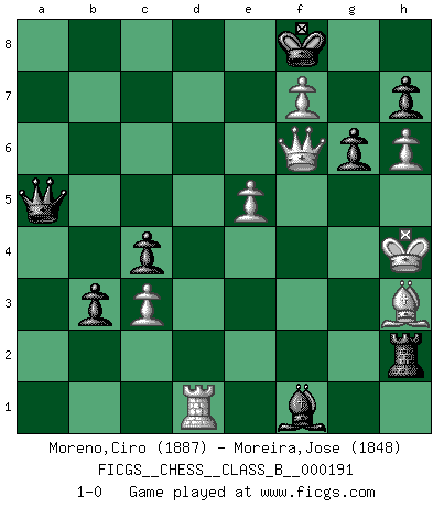 Last move : 1-0 2014 May 26 23:1:2 [Event "FICGS__CHESS__CLASS_B__000191"] [Site "FICGS"] [Date "2013.06.24"] [Round "1"] [White "Moreno,Ciro"] [Black "Moreira,Jose"] [Result "1-0"] [WhiteElo "1887"] [BlackElo "1848"] 1.d4 Nf6 2.Nf3 g6 3.c4 Bg7 4.Nc3 d5 5.Bg5 Ne4 6.Bf4 Nxc3 7.bxc3 dxc4 8.e4 b5 9.a4 c6 10.Be2 Bg4 11.O-O Nd7 12.Qd2 O-O 13.axb5 cxb5 14.Bg5 Nf6 15.Qe3 Qb6 16.Rab1 Rfc8 17.h3 Be6 18.Ne5 a5 19.f4 b4 20.g4 Nd7 21.Nxd7 Bxd7 22.Bxe7 b3 23.f5 a4 24.f6 a3 25.Bxa3 Rxa3 26.fxg7 Qc7 27.Qf3 Be8 28.e5 Ra7 29.Qf4 Kxg7 30.h4 Kg8 31.h5 Qa5 32.h6 Ra6 33.g5 Qb6 34.Bg4 Qb8 35.d5 Qa7+ 36.Kh1 f5 37.gxf6 Bf7 38.Bxc8 Bxd5+ 39.Kh2 Ra2+ 40.Kh3 Qa5 41.Rbd1 Bg2+ 42.Kh4 Bxf1 43.f7+ Kf8 44.Qf6 Rh2+ 45.Bh3 1-0 King's Indian : East Indian defense Kingside Castling by player White (move 11) Kingside Castling by player Black (move 12) Player White won this chess game. Follow this game move after move (download)Bobby Fischer's current state of mind is indeed a tragedy. One of the world's greatest Chess players - the pride and sorrow of American Chess. (Frank Brady) Oft bringt ein stiller Zug das Erdbeben. (Richard Reti) Uno no tiene que jugar muy bien, es suficiente jugar mejor que el oponente. (Siegbert Tarrasch) Il a essayé de se convaincre qu'il pourrait empêcher toutes les erreurs et ne jamais perdre. L'horreur ! Gary Kasparov au sujet de Robert Fischer. The age of a woman doesn't mean a thing. The best tunes are played on the oldest fiddles. (Ralph Waldo Emerson)
