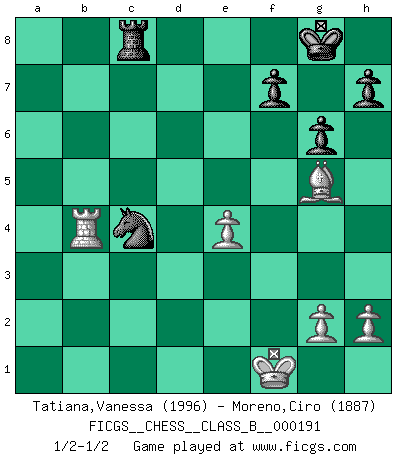 Last move : 1/2-1/2 2014 April 27 22:4:48 [Event "FICGS__CHESS__CLASS_B__000191"] [Site "FICGS"] [Date "2013.06.24"] [Round "1"] [White "Tatiana,Vanessa"] [Black "Moreno,Ciro"] [Result "1/2-1/2"] [WhiteElo "1996"] [BlackElo "1887"] 1.e4 c5 2.Nf3 Nc6 3.d4 cxd4 4.Nxd4 e5 5.Nb5 d6 6.N1c3 a6 7.Na3 b5 8.Nd5 Nf6 9.c4 b4 10.Nxf6+ Qxf6 11.Nc2 Be7 12.Be2 O-O 13.O-O Qg6 14.b3 Bd7 15.Bf3 a5 16.Bb2 a4 17.Ne3 Ra7 18.Nf5 Qf6 19.Ne3 Qg6 20.Nf5 Qf6 21.Rb1 Be6 22.Qd3 g6 23.Nxe7+ Qxe7 24.Be2 Rd8 25.Rbd1 axb3 26.axb3 Ra2 27.Rd2 Rda8 28.f4 exf4 29.Rxf4 Ne5 30.Qd4 Qa7 31.Qxa7 R8xa7 32.Rf2 Nd7 33.Bf1 Ra8 34.Rxd6 Nc5 35.Bd4 Rxf2 36.Bxf2 Nxb3 37.Be3 Rc8 38.Rb6 Bxc4 39.Rxb4 Na5 40.Bg5 Bxf1 41.Kxf1 Nc4 1/2-1/2 Sicilian : Labourdonnais-Loewenthal (Kalashnikov) variation Kingside Castling by player Black (move 12) Kingside Castling by player White (move 13) This chess game ended in a draw. Follow this game move after move (download)Chess, like any creative activity, can exist only through the combined efforts of those who have creative talent, and those who have the ability to organize their creative work. (Mikhail Botvinnik) Wir irren allesamt, nur jeder irrt anders. (Georg Christoph Lichtenberg) Un jugador que es sorprendido, esta derrotado a medias. (Proverbio) Toutes les manuvres exécutées sur une colonne ouverte ont pour but ultime l'intrusion définitive sur la septième ou la huitième rangée, en plein cur de la position ennemie. (Aaron Nimzovitch) Fame, I have already. Now I need the money. (an elderly Steinitz)