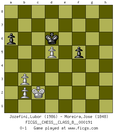 Last move : 0-1 2014 January 10 9:26:33 [Event "FICGS__CHESS__CLASS_B__000191"] [Site "FICGS"] [Date "2013.06.24"] [Round "1"] [White "Jozefini,Lubor"] [Black "Moreira,Jose"] [Result "0-1"] [WhiteElo "1986"] [BlackElo "1848"] 1.e4 c5 2.Nf3 d6 3.d4 cxd4 4.Nxd4 Nf6 5.Nc3 g6 6.Be3 Bg7 7.f3 Nc6 8.Qd2 O-O 9.Bc4 Qc7 10.Bb3 a6 11.h4 h5 12.O-O-O Na5 13.Bg5 Nxb3+ 14.axb3 Qd8 15.Bh6 Bd7 16.Bxg7 Kxg7 17.Qg5 Rc8 18.e5 dxe5 19.Qxe5 Re8 20.Rhe1 Kg8 21.Qg5 Qc7 22.Re5 Kg7 23.g4 hxg4 24.h5 Rh8 25.Rh1 Rxh5 26.Rxh5 Nxh5 27.Rxe7 Qd6 28.fxg4 Nf6 29.Rxd7 Qxd7 30.Nf5+ Kg8 31.Qxf6 gxf5 32.Qg5+ Kf8 33.gxf5 Rc6 34.Kb1 Qd4 35.Qg3 Rh6 36.Qb8+ Kg7 37.Qxb7 Qg4 38.Qe4 Qxe4 39.Nxe4 Rh5 40.Nd6 Rh1+ 41.Ka2 Rd1 42.Ne8+ Kf8 43.Nf6 Rf1 44.Nd5 Rxf5 45.c4 Rxd5 46.cxd5 f5 47.Kb1 Ke7 48.Kc2 Kd6 0-1 Sicilian : Dragon, Yugoslav attack Kingside Castling by player Black (move 8) Queenside Castling by player White (move 12) 10 pieces endgame at move 39 : White KNPPPP , Black KRPP WHITE : King + 1 Knight 4 Pawns BLACK : King + 1 Rook 2 Pawns 9 pieces endgame at move 44 : White KNPPP , Black KRPP WHITE : King + 1 Knight 3 Pawns BLACK : King + 1 Rook 2 Pawns 8 pieces endgame at move 45 : White KPPP , Black KRPP WHITE : King + 3 Pawns BLACK : King + 1 Rook 2 Pawns 7 pieces endgame at move 46 : White KPPP , Black KPP WHITE : King + 3 Pawns BLACK : King + 2 Pawns Player Black won this chess game. Follow this game move after move (download)Chess is a fighting game which is purely intellectual and includes chance. (Richard Reti) Das Spiel gibt uns die Genugtuung, die das Leben uns versagt. (Emanuel Lasker) El Ajedrez es un terrible juego. Si no controlas el centro, tu oponente tiene una posición mas holgada. Si tienes control del centro, ¡entonces realmente tu tienes algo de que preocuparte!. (Siegbert Tarrasch) L'ordinateur a tué l'originalité. Il n'y a plus guère d'aventures sur l'échiquier. (Jacob Murray) In every real man a child is hidden that wants to play. (Friedrich Nietzsche)
