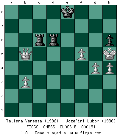 Last move : 1-0 2014 June 23 16:4:15 [Event "FICGS__CHESS__CLASS_B__000191"] [Site "FICGS"] [Date "2013.06.24"] [Round "1"] [White "Tatiana,Vanessa"] [Black "Jozefini,Lubor"] [Result "1-0"] [WhiteElo "1996"] [BlackElo "1986"] 1.e4 c6 2.d4 d5 3.Nc3 dxe4 4.Nxe4 Nd7 5.Nf3 Ngf6 6.Nxf6+ Nxf6 7.c3 Bf5 8.Bd3 Bxd3 9.Qxd3 Qc7 10.O-O e6 11.Re1 Bd6 12.Bg5 Nd7 13.Bh4 O-O 14.c4 Rfe8 15.c5 Bf4 16.Rad1 Qa5 17.Qc4 Qb5 18.Qc2 h6 19.Re4 Bc7 20.a4 Qa6 21.Ne5 f5 22.Nxd7 fxe4 23.Qxe4 Bd8 24.Bxd8 Rexd8 25.Nf6+ Kf7 26.Nh5 Qxa4 27.Qf3+ Ke7 28.b3 Qa2 29.Qg3 g6 30.Re1 Qd2 31.Qe5 Qxe1+ 32.Qxe1 gxh5 33.Qe5 Rf8 34.Qc7+ Kf6 35.Qxb7 Rad8 36.Qxc6 Rxd4 37.g3 h4 38.Qb7 a5 39.Kg2 Rb4 40.Qf3+ Ke7 41.Qd3 Rd8 42.Qh7+ Ke8 43.c6 Rb6 44.Qc7 Ra6 45.Qb7 R6a8 46.c7 Rdc8 47.Qc6+ Ke7 48.g4 Rf8 49.Kh3 Rac8 50.Kxh4 Rf6 51.Kh5 e5 52.Qc5+ Kd7 53.Qxe5 Re6 54.Qd5+ Rd6 55.Qxa5 Rxc7 56.Qf5+ Re6 57.f4 R7c6 58.Qb5 Ke8 59.f5 Red6 60.h4 1-0 Caro-Kann : Steinitz variation Kingside Castling by player White (move 10) Kingside Castling by player Black (move 13) 10 pieces endgame at move 55 : White KQPPPP , Black KRRP WHITE : King + 1 Queen 4 Pawns BLACK : King + 2 Rooks 1 Pawn Player White won this chess game. Follow this game move after move (download)Nonsense was the last thing Fischer was interested in, as far as Chess was concerned. (Elie Agur) Wie bekannt hörte Morphy 1859 auf, Schach zu spielen. Seine Enttäuschung galt nicht so sehr dem Schach, wie den Schachspielern. (Robert James Fischer) El Ajedrez no es como la vida... ¡tiene reglas!. (Mark Pasternak) 'L'échange des dames est un coup dur pour les deux adversaires...' Un journaliste lors d'une partie du match Spassky-Fischer Whoever said the pen is mightier than the sword obviously never encountered automatic weapons. (US General Douglas MacArthur)