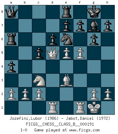 Last move : 1-0 2014 January 27 12:0:25 [Event "FICGS__CHESS__CLASS_B__000191"] [Site "FICGS"] [Date "2013.06.24"] [Round "1"] [White "Jozefini,Lubor"] [Black "Jabot,Daniel"] [Result "1-0"] [WhiteElo "1986"] [BlackElo "1972"] 1.e4 c5 2.Nf3 d6 3.d4 cxd4 4.Nxd4 Nf6 5.Nc3 a6 6.Bc4 g6 7.Bg5 Bg7 8.Qd2 O-O 9.f3 Nc6 10.Nxc6 bxc6 11.O-O a5 12.Na4 Re8 13.Rad1 Nd7 14.Be3 Ba6 15.Bxa6 Rxa6 16.f4 c5 17.e5 Qc8 18.Nc3 a4 19.Bf2 Nf8 20.Qd5 Ne6 21.Be3 Qa8 22.f5 1-0 This chess game has been lost on time (started : 2013.06.24 20:41:22) Sicilian : Najdorf, Lipnitzky attack Kingside Castling by player Black (move 8) Kingside Castling by player White (move 11) Player White won this chess game. Follow this game move after move (download)All I want to do, ever, is just play Chess. (Bobby Fischer) Ich trinke, ich rauche, ich spiele, ich liebe Frauen aber Fernschach ist ein Laster, das ich nicht habe. (Mikhail Nekhemyevich Tal) El Ajedrez es una manera fabulosa para que los niños aprendan a autovalorarse y a autoestimarse. (Saudin Robovic) Je crois qu'il existe des manières très spécifiques de jouer efficacement contre une machine. Evidemment, nous n'avons aucune chance en technique pure, parce que l'ordinateur calcule de manière parfaite. Mais lorsque nous faisons appel à notre cerveau, en utilisant l'intuition et la compréhension, alors nous restons beaucoup plus forts. (Anatoli Karpov) History is the quarrels of popes and kings, with wars or pestilences in every page; the men all so good for nothing, and hardly any women at all. (Jane Austen)