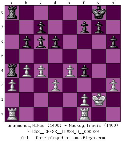Last move : 0-1 2007 July 24 0:26:35 [Event "FICGS__CHESS__CLASS_D__000029"] [Site "FICGS"] [Date "2007.02.01"] [Round "1"] [White "Grammenos,Nikos"] [Black "Mackoy,Travis"] [Result "0-1"] [WhiteElo "1400"] [BlackElo "1400"] 1.e4 e5 2.Nf3 Nc6 3.Bc4 Bc5 4.Nc3 Nf6 5.O-O O-O 6.a3 d6 7.d3 Bg4 8.h3 Bh5 9.Bg5 h6 10.Bxf6 Qxf6 11.Nd5 Qd8 12.b4 Bb6 13.Nxb6 axb6 14.Bd5 Qf6 15.Bxc6 bxc6 16.c4 Bxf3 17.Qxf3 Qxf3 18.gxf3 Ra4 19.Kg2 Rfa8 20.f4 exf4 0-1 Giuoco Piano : Four knights variation Kingside Castling by player White (move 5) Kingside Castling by player Black (move 5) Player Black won this chess game. Follow this game move after move (download)Checkers is for tramps. (Paul Morphy) Man wirke der falschen Auffassung entgegen, als ob jeder Zug Unmittelbares zu leisten habe; auch Werte- und Ruhezüge haben ihre Existenzberechtigung. (Aaron Nimzowitsch) El jugador táctico debe saber que hacer cuando algo se debe de hacer. El estratégico debe saber que hacer cuando nada se debe de hacer. (Savielly Tartakover) Il (Jacob Murray) ne joue pas pour le bon coup, mais pour le meilleur. (Eloi Relange) All battles are fought by scared men who'd rather be someplace else. (John Wayne in the movie In harm's way)