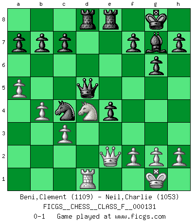 Last move : 0-1 2013 July 11 19:49:45 [Event "FICGS__CHESS__CLASS_F__000131"] [Site "FICGS"] [Date "2013.06.25"] [Round "1"] [White "Beni,Clement"] [Black "Neil,Charlie"] [Result "0-1"] [WhiteElo "1109"] [BlackElo "1053"] 1.e4 d6 2.Nc3 g6 3.a4 Bg7 4.Ra3 Nf6 5.Nf3 Nbd7 6.d4 O-O 7.Be2 e5 8.Nd5 Nxd5 9.exd5 Nb6 10.dxe5 dxe5 11.O-O Re8 12.Bb5 Bd7 13.Bxd7 Qxd7 14.a5 Nc4 15.b4 Nxa3 16.Re1 e4 17.Nd4 Nc4 18.Qe2 Qxd5 19.Be3 Nxe3 20.c3 Nc4 21.Rd1 Rad8 0-1 King's pawn Opening Kingside Castling by player Black (move 6) Kingside Castling by player White (move 11) Player Black won this chess game. Follow this game move after move (download)Pawns are born free, yet they are everywhere in chains. (Rick Kennedy) Ich bin stolz ein Bulgare zu sein. (Veselin Topalov) Entre mas años cumplo, mas valoro los Peones. (Keres) L'action d'une oeuvre littéraire se déroule sur un champ de bataille. Les masques et les types du drame moderne correspondent aux pièces du jeu d'échecs. L'intrigue correspond aux coups et aux gambits, c'est à dire aux techniques du jeu telles qu'utilisées et interprétées par les joueurs. Les tactiques et les péripéties [mouvements] correspondent aux coups exécutés par l'adversaire. (Viktor Shklovsky) There are two kinds of tragedy in this world, one is not getting what you want and the other is getting. (Lord of war)