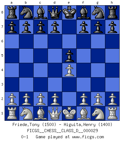 Last move : 0-1 2007 March 16 8:1:29 [Event "FICGS__CHESS__CLASS_D__000029"] [Site "FICGS"] [Date "2007.02.01"] [Round "1"] [White "Friede,Tony"] [Black "Higuita,Henry"] [Result "0-1"] [WhiteElo "1500"] [BlackElo "1400"] 1.e4 e5 0-1 This chess game has been lost on time (started : 2007.02.01 17:54:59) King's pawn game Player Black won this chess game. Follow this game move after move (download)Chess is so inspiring that I do not believe a good player is capable of having an evil thought during the game. (Wilhelm Steinitz) Intelligenz läßt sich nicht am Weg, sondern nur am Ergebnis feststellen. (Garry Kasparov) La maestría del Ajedrez consiste esencialmente en analizar posiciónes de Ajedrez con precisión. (Mikhail Botvinnik) Même si l'adversaire joue le coup analysé précédemment, recommencez l'analyse en voyant la nouvelle position. Première règle de Blumenfeld There are three kinds of lies: lies, damned lies and statistics. (Mark Twain)