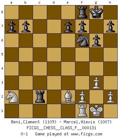 Last move : 0-1 2013 July 11 19:5:44 [Event "FICGS__CHESS__CLASS_F__000131"] [Site "FICGS"] [Date "2013.06.25"] [Round "1"] [White "Beni,Clement"] [Black "Marcel,Alexis"] [Result "0-1"] [WhiteElo "1109"] [BlackElo "1007"] 1.e4 g6 2.a4 Bg7 3.Ra3 c5 4.Nf3 Nc6 5.d3 d6 6.a5 Nxa5 7.Bd2 Nc6 8.c4 Bxb2 9.Ra2 Bg7 10.Bc3 Bxc3+ 11.Nxc3 Nf6 12.Be2 O-O 13.d4 cxd4 14.Nxd4 Nxd4 15.Qxd4 Be6 16.e5 dxe5 17.Qxe5 Qb6 18.Na4 Qa6 19.c5 Qa5+ 20.Qc3 Qxc3+ 21.Nxc3 Bxa2 22.Nxa2 Rac8 23.O-O Rxc5 24.g3 Rc2 0-1 Robatsch (Modern) defense Kingside Castling by player Black (move 12) Kingside Castling by player White (move 23) Player Black won this chess game. Follow this game move after move (download)When you are lonely, when you feel yourself an alien in the world, play Chess. This will raise your spirits and be your counselor in war. (Aristotle) Oft bringt ein stiller Zug das Erdbeben. (Richard Reti) Todo se encuentra en un estado de flujo y esto incluye al mundo del Ajedrez. (Mikhail Botvinnik) Je ne suis pas le dernier à jouer lâchement des coups douteux pendant le zeïtnot de l'adversaire pour l'achever: en effet les coups qui font le plus peur sont ceux que l'on ne comprend pas. Je me fais souvent peur quand je joue. (Un professeur anonyme) Chess, like love, like music, has the power to make people happy. (Siegbert Tarrasch)