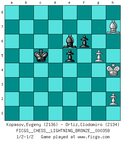 Last move : 1/2-1/2 2013 June 26 15:0:47 [Event "FICGS__CHESS__LIGHTNING_BRONZE__000358"] [Site "FICGS"] [Date "2013.06.26"] [Round "1"] [White "Kopasov,Evgeny"] [Black "Ortiz,Clodomiro"] [Result "1/2-1/2"] [WhiteElo "2136"] [BlackElo "2134"] 1.d4 Nf6 2.c4 e6 3.Nc3 Bb4 4.Qc2 O-O 5.a3 Bxc3+ 6.Qxc3 b6 7.Bg5 c5 8.dxc5 bxc5 9.e3 d6 10.Bxf6 Qxf6 11.Qxf6 gxf6 12.b4 Bb7 13.Nf3 Rd8 14.Be2 Kf8 15.O-O Nd7 16.Rfd1 Ke7 17.b5 Rac8 18.a4 Rg8 19.Kf1 Ne5 20.Ne1 d5 21.Rac1 dxc4 22.f3 Rcd8 23.Rxd8 Rxd8 24.Bxc4 Rd2 25.Be2 Ra2 26.Rxc5 Kd6 27.Rc2 Rxa4 28.Rd2+ Ke7 29.Rc2 Bd5 30.Nd3 Nxd3 31.Bxd3 f5 32.Rc7+ Kf6 33.Kf2 Ra2+ 34.Kg3 Ra3 35.Bf1 Rxe3 36.Rxa7 e5 37.Ra6+ Ke7 38.Ra5 Rb3 39.b6 Kd6 40.Rb5 Kc6 41.Rxb3 Bxb3 42.Bd3 Be6 43.Kh4 f6 44.g4 fxg4 45.fxg4 Kxb6 46.Bxh7 Kc5 47.g5 1/2-1/2 Nimzo-Indian : Classical variation Kingside Castling by player Black (move 4) Kingside Castling by player White (move 15) 10 pieces endgame at move 45 : White KBPPP , Black KBPPP WHITE : King + 1 Bishop 3 Pawns BLACK : King + 1 Bishop 3 Pawns 9 pieces endgame at move 45 : White KBPP , Black KBPPP WHITE : King + 1 Bishop 2 Pawns BLACK : King + 1 Bishop 3 Pawns 8 pieces endgame at move 46 : White KBPP , Black KBPP WHITE : King + 1 Bishop 2 Pawns BLACK : King + 1 Bishop 2 Pawns This chess game ended in a draw. Follow this game move after move (download)You are for me the Queen on d8 and I am the Pawn on d7 !! (Eduard Gufeld) Ich hatte Zahnschmerzen im ersten Spiel. In der zweiten Partie tat mir der Kopf weh. In der dritten war es eine Rheuma-Attacke und während der vierten fühlte ich mich nicht gut. Und in der fünften? Nun, man muss doch nicht jedes Spiel gewinnen, oder? (Savielly Grigorievitsch Tartakower) Cuando tu casa esta en llamas, no puedes ser molestado por tus vecinos. O, como decinos en Ajedrez, si tu Rey esta bajo ataque, no te preocupa perder un Peón del lado de la Reina. (Gary Kasparov) Shah mat. Le roi est mort. Cri de fierté d'un joueur venant de terrasser son adversaire, courtoisement, sans effusion de sang. Looking at the proliferation of personal web pages on the Net, it looks like very soon everyone on Earth will have 15 megabytes of fame. (M.G. Sriram)