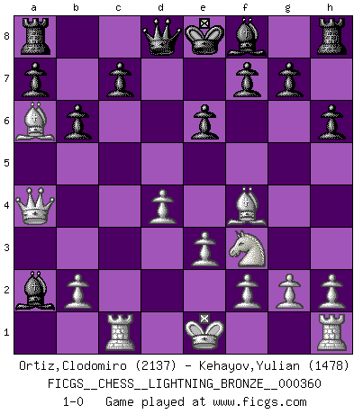 Last move : 1-0 2013 June 26 22:57:41 [Event "FICGS__CHESS__LIGHTNING_BRONZE__000360"] [Site "FICGS"] [Date "2013.06.26"] [Round "1"] [White "Ortiz,Clodomiro"] [Black "Kehayov,Yulian"] [Result "1-0"] [WhiteElo "2137"] [BlackElo "1478"] 1.d4 d5 2.c4 e6 3.Nc3 h6 4.Nf3 Nf6 5.Bf4 b6 6.e3 Bb7 7.Rc1 Na6 8.cxd5 Nxd5 9.Nxd5 Bxd5 10.Bxa6 Bxa2 11.Qa4+ 1-0 QGD : 3.Nc3 Player White won this chess game. Follow this game move after move (download)I look one move ahead... the best ! (Siegbert Tarrasch) Sicherlich können nur Meister einen Stil haben. Daß ein nicht-Meister auch nur ein einziges Mal in seinem Leben eine Partie folgerecht durchführte, habe ich niemals bemerkt. (Emanuel Lasker) El Rey es una pieza de pelea. ¡Usenlo!. (Wilhelm Steinitz) Roi des jeux et jeu des rois, les échecs portent en eux un sentiment d'infini. Ils donnent à celui qui s'est efforcé d'en approfondir les arcanes l'impression de n'être pas à la mesure de l'homme; en fait, ils constituent un résumé de l'univers, un microcosme, et figurent cette grande échelle qui, dans les plans de la lumière descend jusqu'à la matière, qui des abîmes insondables remonte jusqu'en l'infini de Dieu. (Pyrame) Have no fear of perfection - you'll never reach it. (Salvador Dali)