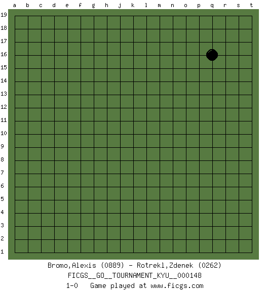 Last move : 1-0 2013 July 27 16:17:6 [Event "FICGS__GO__TOURNAMENT_KYU__000148"] [Site "FICGS"] [Date "2013.06.27"] [Round "1"] [Black "Bromo,Alexis"] [White "Rotrekl,Zdenek"] [Result "1-0"] [Rating 1 "0889"] [Rating 2 "0262"] 1.q16 1-0 This go game has been lost on time (started : 2013.06.27 6:32:30) Here are the names of the openings (joseki) played in the four corners : Player Black won this Go (weiqi, baduk) game. Follow this game move after move (download)In opponents' sphere of influence, avoid sharp conflict, don't move too deep. (Otake Hideo, 9p) There are 10 types of people in this world: those who understand binary and those who don't. (Anonymous)
