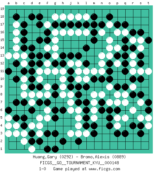 Last move : 1-0 2014 January 31 19:29:24 [Event "FICGS__GO__TOURNAMENT_KYU__000148"] [Site "FICGS"] [Date "2013.06.27"] [Round "1"] [Black "Huang,Gary"] [White "Bromo,Alexis"] [Result "1-0"] [Rating 1 "0292"] [Rating 2 "0889"] 1.q15 d4 2.d6 d16 3.c4 c3 4.c5 k4 5.d3 e3 6.d2 e5 7.e2 f2 8.f3 e4 9.g3 g2 10.h2 j3 11.g5 f6 12.g6 f5 13.f7 c2 14.f1 d1 15.g1 b4 16.b5 b3 17.a4 a3 18.d11 k16 19.m4 m6 20.l5 k5 21.l6 k6 22.k7 j7 23.k8 j8 24.j9 h8 25.h6 j6 26.g8 h9 27.j10 h10 28.j11 h11 29.h12 g11 30.g12 f11 31.e12 f12 32.f13 e11 33.d10 e10 34.e9 f9 35.g9 e8 36.d9 f8 37.e7 d8 38.d13 d7 39.c7 c8 40.b7 c9 41.b10 c10 42.c11 b11 43.b12 c12 44.d12 c13 45.c14 b13 46.a11 b14 47.c15 b15 48.c16 b16 49.c17 b17 50.b18 a13 51.e15 e16 52.f16 d17 53.d18 f17 54.g17 g16 55.f15 g18 56.h17 h18 57.j17 j18 58.k17 k18 59.l17 l18 60.m18 l16 61.m16 h16 62.l14 j16 63.m17 g15 64.e18 d15 65.d14 f14 66.e17 g13 67.e13 j12 68.h13 g14 69.j13 k12 70.k13 k11 71.l9 k10 72.k9 l10 73.m10 m11 74.n10 n11 75.l12 l11 76.o11 n12 77.o12 n13 78.p9 o13 79.p13 o14 80.m15 o15 81.q3 r6 82.r8 s7 83.r4 q5 84.s8 q7 85.p6 p7 86.o6 p5 87.o5 o7 88.n7 q8 89.q9 m7 90.l7 n8 91.n6 m8 92.o4 p4 93.p3 s5 94.s4 o9 95.o10 p8 96.t6 t5 97.t7 t4 98.s3 m5 99.l4 l3 100.k2 k3 101.m3 a5 102.a6 a4 103.q17 p16 104.p17 o17 105.o18 q16 106.r16 p14 107.q14 r15 108.r14 s15 109.s16 s14 110.s13 r13 111.q13 r12 112.s12 p12 113.q12 r11 114.q11 r9 115.r10 s11 116.s10 t11 117.t15 n16 118.n17 1-0 Here are the names of the openings (joseki) played in the four corners : Corner d4 : d4 d6 Hoshi (Hwajeom, Seongjeom, Xingwei`) 4-4 Point. The star or hoshi (4-4) point, emphasizing influence at the potential expense of territory. Ikken Takagakari (Hankan Nop'dakeolch'im, Yi Gaojia, 1-Space High Approach). White typically responds at 6-4 or 3-10. White 4-10 is played when White finds play on the right side advantageous. White 4-8 or 3-8 may be played when White has support at top. Corner d16 : d16 d11 Hoshi (Hwajeom, Seongjeom, Xingwei`) 4-4 Point. The star or hoshi (4-4) point, emphasizing influence at the potential expense of territory. Corner q4 : m4 m6 This joseki is unknown. A weak or weird move has probably been played in this corner. Player Black won this Go (weiqi, baduk) game. Follow this game move after move (download)Knight's moves win running battles. (Anonymous) . 'gn is not allowed in chess unless n is an integer between 1 and 8 inclusive, where 1 and 8 are to interpreted as the standard numerals standing for integers in the ordered real-closed field R, with the *canonical* ordering. (As opposed to, say, an integer in the domain Z[2+i*sqrt(5)] or an integer in some exotic Grothendieck topos). (Normajean Yates)