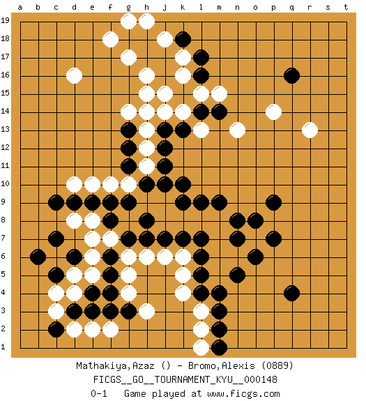 Last move : 0-1 2013 August 7 1:43:2 [Event "FICGS__GO__TOURNAMENT_KYU__000148"] [Site "FICGS"] [Date "2013.06.27"] [Round "1"] [Black "Mathakiya,Azaz"] [White "Bromo,Alexis"] [Result "0-1"] [Rating 2 "0889"] 1.q16 d4 2.q4 d16 3.k10 g10 4.j11 k16 5.h10 h9 6.j10 j9 7.k9 k8 8.l9 l8 9.m9 m8 10.g9 g8 11.f9 f10 12.f8 f7 13.h8 j8 14.g7 g6 15.f6 e7 16.h7 h6 17.j7 j6 18.k7 k6 19.l7 m7 20.l6 m6 21.l5 k5 22.n7 m5 23.l4 k4 24.m4 n6 25.n8 o7 26.o6 h11 27.n5 e8 28.e9 e10 29.d9 d8 30.c9 d10 31.p9 n13 32.p7 l3 33.m3 l2 34.m2 p14 35.m1 l1 36.o8 r13 37.c7 c6 38.d6 e6 39.f5 e5 40.f4 g4 41.e4 d5 42.d3 c3 43.c5 c4 44.b6 d2 45.e3 e2 46.f3 f2 47.g3 g5 48.c2 h3 49.g11 h12 50.g12 h13 51.g13 g14 52.h14 j14 53.j13 h15 54.j12 h14 55.j16 h16 56.k15 k14 57.l14 l15 58.l16 j15 59.j17 k17 60.l17 j18 61.h17 g17 62.h18 h19 63.g18 f18 64.k18 g19 65.k13 l13 66.m14 m15 0-1 Here are the names of the openings (joseki) played in the four corners : Corner d16 : d16 j11 Hoshi (Hwajeom, Seongjeom, Xingwei`) 4-4 Point. The star or hoshi (4-4) point, emphasizing influence at the potential expense of territory. Corner q16 : q16 n13 Hoshi (Hwajeom, Seongjeom, Xingwei`) 4-4 Point. The star or hoshi (4-4) point, emphasizing influence at the potential expense of territory. Player White won this Go (weiqi, baduk) game. Follow this game move after move (download)Don't overlook the edge of the board. (Anonymous) All art requires courage. (Anne Tucker)