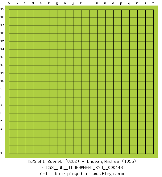 Last move : 0-1 2013 July 27 16:17:6 [Event "FICGS__GO__TOURNAMENT_KYU__000148"] [Site "FICGS"] [Date "2013.06.27"] [Round "1"] [Black "Rotrekl,Zdenek"] [White "Endean,Andrew"] [Result "0-1"] [Rating 1 "0262"] [Rating 2 "1036"] 0-1 This go game has been lost on time (started : 2013.06.27 6:32:30) Here are the names of the openings (joseki) played in the four corners : Player White won this Go (weiqi, baduk) game. Follow this game move after move (download)Error is one of the sources of transformation. (Pierre Audouard) The faster the computer, the slower the brain. (Thibault de Vassal)