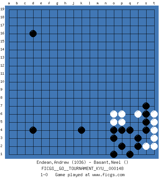 Last move : 1-0 2013 August 6 18:48:35 [Event "FICGS__GO__TOURNAMENT_KYU__000148"] [Site "FICGS"] [Date "2013.06.27"] [Round "1"] [Black "Endean,Andrew"] [White "Basant,Neel"] [Result "1-0"] [Rating 1 "1036"] 1.q4 r6 2.o3 o6 3.d16 p5 4.p4 p3 5.p2 p1 6.q1 q2 7.o1 q3 8.r3 o5 9.o4 p6 10.k4 s2 11.r2 t2 12.d4 t3 13.s4 t4 14.s5 t5 15.s6 t6 16.s7 1-0 Here are the names of the openings (joseki) played in the four corners : Corner q4 : q4 r6 Hoshi (Hwajeom, Seongjeom, Xingwei`) 4-4 Point. The star or hoshi (4-4) point, emphasizing influence at the potential expense of territory. Ikken Kakari (Hankan Keolch'im, Yi Gua`jiao~, 1-Space Low Approach). White 2 is the standard approach move to the 4-4. Player Black won this Go (weiqi, baduk) game. Follow this game move after move (download)Studying go is a wonderful way to develop both the creative as well as the logical abilities of children because to play it both sides of the brain are necessary. (Cho Chikun) I have opinions of my own - strong opinions - but I don't always agree with them. (George Bush)