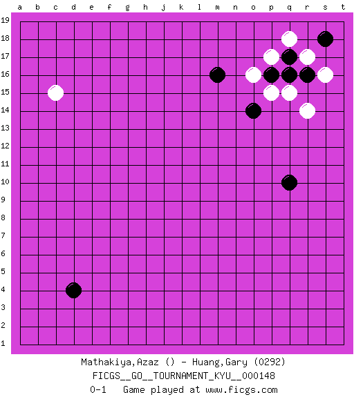 Last move : 0-1 2013 August 7 1:40:54 [Event "FICGS__GO__TOURNAMENT_KYU__000148"] [Site "FICGS"] [Date "2013.06.27"] [Round "1"] [Black "Mathakiya,Azaz"] [White "Huang,Gary"] [Result "0-1"] [Rating 2 "0292"] 1.q16 c15 2.d4 r14 3.q10 o16 4.m16 p15 5.o14 q15 6.s18 r17 7.p16 p17 8.q17 q18 9.r16 s16 0-1 Here are the names of the openings (joseki) played in the four corners : Corner q16 : q16 r14 Hoshi (Hwajeom, Seongjeom, Xingwei`) 4-4 Point. The star or hoshi (4-4) point, emphasizing influence at the potential expense of territory. Ikken Kakari (Hankan Keolch'im, Yi Gua`jiao~, 1-Space Low Approach). White 2 is the standard approach move to the 4-4. Player White won this Go (weiqi, baduk) game. Follow this game move after move (download)There is damezumari at the bamboo joint. (Anonymous) Over-the-board chess is the favorite of mortals, correspondence chess is the favorite of the gods. (Eduard Dyckhoff)