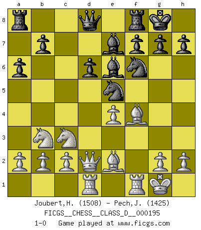 Last move : 1-0 2013 September 10 14:1:24 [Event "FICGS__CHESS__CLASS_D__000195"] [Site "FICGS"] [Date "2013.06.27"] [Round "1"] [White "Joubert,Hennie"] [Black "Pech,Jaroslav senior"] [Result "1-0"] [WhiteElo "1508"] [BlackElo "1425"] 1.e4 c5 2.Nf3 d6 3.d4 cxd4 4.Nxd4 Nf6 5.Nc3 a6 6.Be2 e5 7.Nb3 Be7 8.O-O O-O 9.Bg5 Be6 10.f4 exf4 11.Bxf4 Nc6 12.Qd2 Ne5 13.Rad1 1-0 Sicilian : Najdorf, Opovcensky variation Kingside Castling by player White (move 8) Kingside Castling by player Black (move 8) Player White won this chess game. Follow this game move after move (download)It's just you and your opponent at the board and you're trying to prove something. (Bobby Fischer) Ich spiele ehrlich und spiele, um zu gewinnen. Wenn ich verliere nehme ich meine Medizin. (Robert James Fischer) Con o sin el título, Bobby Fischer fue sin lugar a dudas el mas grande jugador de su época. (Burt Hochberg) Le moment que je préfère le plus dans une rencontre, c'est celui où je sens que la personnalité de l'adversaire se brise. (Robert Fischer) In fact if nothing is done against this teddy bear, hereby I announce that I would quit chess, rapid chess, blitz chess, postal chess, email chess, server chess and correspondence chess I will then switch to a table game where teddy bears aren't going to be seen for a while, like Poker, or Roulette, all 18+ games. (Elmer Valderrama)