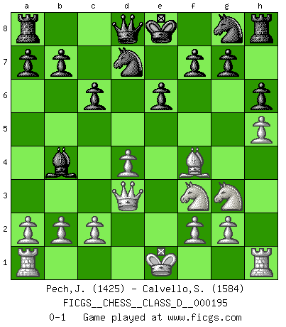Last move : 0-1 2013 September 10 14:1:31 [Event "FICGS__CHESS__CLASS_D__000195"] [Site "FICGS"] [Date "2013.06.27"] [Round "1"] [White "Pech,Jaroslav senior"] [Black "Calvello,Simone"] [Result "0-1"] [WhiteElo "1425"] [BlackElo "1584"] 1.e4 c6 2.d4 d5 3.Nc3 dxe4 4.Nxe4 Bf5 5.Ng3 Bg6 6.h4 h6 7.Nf3 Nd7 8.h5 Bh7 9.Bd3 Bxd3 10.Qxd3 e6 11.Bf4 Bb4+ 0-1 Caro-Kann : Classical, 7...Nd7 Player Black won this chess game. Follow this game move after move (download)It is always better to sacrifice your opponent's men. (Savielly Tartakower) Die Elozahlen sind sehr schlecht für das Schach. Jetzt ist Schach eine Sportindustrie, die darauf zielt Elopunkte zu machen. (Miguel Najdorf) Yo tuve un dolor de muelas en la primer partida. En el segundo juego, tuve un dolor de cabeza. En el tercero, tuve un ataque de reumatísmo. En la cuarta partida, no me sentía muy bien. ¿Y en el quinto juego? Bueno, ¿que acaso uno tiene que ganar todos los juegos?. (Siegbert Tarrasch) Les Cavaliers se révèlent fort utiles dans les positions fermées. D'habitude, les Fous sont un peu plus forts que les Cavaliers dans les positions ouvertes. Qu'on le veuille ou non, il restera toujours des exceptions ! Train yourself to let go of everything you fear to lose. (Master Yoda in Star Wars ep.3)