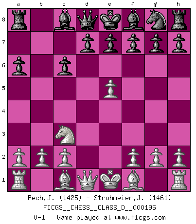 Last move : 0-1 2013 September 10 13:35:42 [Event "FICGS__CHESS__CLASS_D__000195"] [Site "FICGS"] [Date "2013.06.27"] [Round "1"] [White "Pech,Jaroslav senior"] [Black "Strohmeier,Josef"] [Result "0-1"] [WhiteElo "1425"] [BlackElo "1461"] 1.e4 c5 2.Nf3 Nc6 3.d4 cxd4 4.Nxd4 Nf6 5.Nc3 a6 6.Nxc6 bxc6 7.e5 Ng8 0-1 This chess game has been lost on time (started : 2013.06.27 10:55:27) Sicilian defense Player Black won this chess game. Follow this game move after move (download)We don't really know how the game was invented, though there are suspicions. As soon as we discover the culprits, we'll let you know. (Bruce Pandolfini) Ich verstehe mehr vom Schach als irgendein anderer lebender Meister. (José Raúl Capablanca) El Ajedrez, como la música, como el amor, tiene el poder de hacer feliz a la gente. (Siegbert Tarrasch) Même si l'adversaire joue le coup analysé précédemment, recommencez l'analyse en voyant la nouvelle position. Première règle de Blumenfeld Beta. Software undergoes beta testing shortly before it's released. Beta is latin for still doesn't work. (Anonymous)