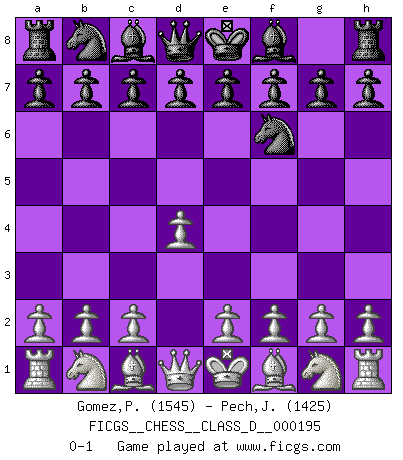 Last move : 0-1 2013 August 7 5:16:2 [Event "FICGS__CHESS__CLASS_D__000195"] [Site "FICGS"] [Date "2013.06.27"] [Round "1"] [White "Gomez,Pablo"] [Black "Pech,Jaroslav senior"] [Result "0-1"] [WhiteElo "1545"] [BlackElo "1425"] 1.d4 Nf6 0-1 This chess game has been lost on time (started : 2013.06.27 10:55:27) Queen's pawn game Player Black won this chess game. Follow this game move after move (download)Morphy was probably the greatest genius of them all. (Bobby Fischer) Im Reiche der Wirklichkeit ist man nie so glücklich wie im Reiche der Gedanken. (Arthur Schopenhauer) ¿Se han dado cuenta de que Fischer casi nunca ha tenido piezas malas? El las intercambia y las piezas malas se quedan con sus oponenets. (Yuri Balashov) On croit qu'il y a plus de mauvais joueurs que de bons joueurs, c'est faux : Il y a autant de joueurs qui gagnent que de joueurs qui perdent. (Philippe Geluck) Philosophers use a language that is already deformed as though by shoes that are too tight. (Ludwig Wittgenstein)