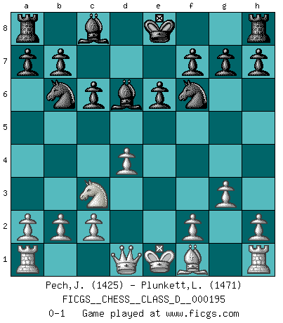 Last move : 0-1 2013 September 10 14:1:41 [Event "FICGS__CHESS__CLASS_D__000195"] [Site "FICGS"] [Date "2013.06.27"] [Round "1"] [White "Pech,Jaroslav senior"] [Black "Plunkett,Louis"] [Result "0-1"] [WhiteElo "1425"] [BlackElo "1471"] 1.e4 d5 2.exd5 Qxd5 3.Nc3 Qd6 4.d4 Nf6 5.Nf3 c6 6.Ne5 Nbd7 7.Bf4 Qb4 8.Nc4 e6 9.Bd6 Qxd6 10.Nxd6+ Bxd6 11.g3 Nb6 0-1 Scandinavian : Pytel-Wade variation Player Black won this chess game. Follow this game move after move (download)I have never in my life played the French Defence, which is the dullest of all openings. (Wilhelm Steinitz) Habe Mut, dich deines eigenen Verstandes zu bedienen. (Immanuel Kant) Alekhine es un poeta que crea un trabajo de arte de algo que raramente inspiraría a otra persona a mandar una tarjeta postal. (Max Euwe) Nous sommes les pions de la mystérieuse partie d'Echecs jouée par Dieu. Il nous déplace, nous arrête, nous pousse encore, puis nous lance un à un dans la boîte du Néant. Epitaphe sur la tombe de David Janowsky (1868-1927). Without deviation from the norm, progress is not possible. (Frank Zappa)