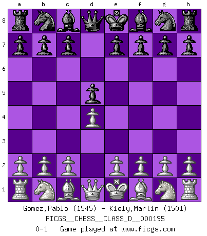 Last move : 0-1 2013 August 9 5:47:20 [Event "FICGS__CHESS__CLASS_D__000195"] [Site "FICGS"] [Date "2013.06.27"] [Round "1"] [White "Gomez,Pablo"] [Black "Kiely,Martin"] [Result "0-1"] [WhiteElo "1545"] [BlackElo "1501"] 1.d4 d5 0-1 This chess game has been lost on time (started : 2013.06.27 10:55:27) Queen's pawn game Player Black won this chess game. Follow this game move after move (download)Fischer Chess play was always razor-sharp, rational and brilliant. One of the best ever. (Dave Regis) Konzentriere dich auf materielle Gewinne. Nimm, was dir dein Gegner gibt, ausser es gibt einen guten Grund der dagegenspricht. (Robert James Fischer) Nos gusta pensar. (Gary Kasparov) L'attaque fait le spectacle, la défense gagne les matchs. (Dicton footballistique) Hold em is to stud what chess is to checkers. (Johnny Moss)