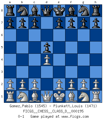 Last move : 0-1 2013 August 7 5:16:2 [Event "FICGS__CHESS__CLASS_D__000195"] [Site "FICGS"] [Date "2013.06.27"] [Round "1"] [White "Gomez,Pablo"] [Black "Plunkett,Louis"] [Result "0-1"] [WhiteElo "1545"] [BlackElo "1471"] 1.d4 d5 0-1 This chess game has been lost on time (started : 2013.06.27 10:55:27) Queen's pawn game Player Black won this chess game. Follow this game move after move (download)He who fears an isolated Queen's Pawn should give up Chess. (Siegbert Tarrasch) Ein typischer, sehr verbreiteter Gedankenschädling ist der, daß der betreffende Amateur von der Annanhme ausgeht, daß jeder einzelne Zug etwas zu leisten habe. (Aaron Nimzowitsch) El hombre es un frívolo, una creatura engañosa y como un jugador de Ajedrez, se preocupa mas por el proceso de obtener su meta que de la meta por sí misma. (Dostoyevsky) Il s'avisa de me proposer d'apprendre les échecs qu'il jouait un peu... me voilà forcené des échecs. J'achète un échiquier, je m'enferme dans ma chambre, j'y passe des jours et des nuits à vouloir apprendre par cur toutes les parties. (Jean-Jacques Rousseau, Confessions) Dave, my mind is going. I can feel it. (HAL 9000 in 2001, a space odyssey)