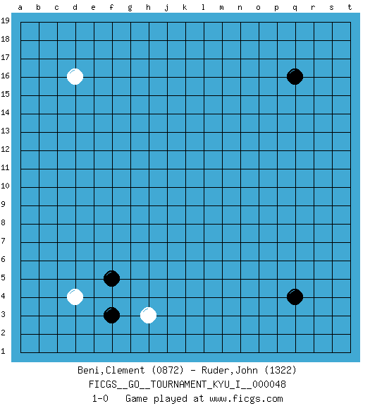 Last move : 1-0 2013 August 2 5:1:3 [Event "FICGS__GO__TOURNAMENT_KYU_I__000048"] [Site "FICGS"] [Date "2013.06.28"] [Round "1"] [Black "Beni,Clement"] [White "Ruder,John"] [Result "1-0"] [Rating 1 "0872"] [Rating 2 "1322"] 1.q16 d4 2.q4 d16 3.f3 h3 4.f5 1-0 This go game has been lost on time (started : 2013.06.28 21:55:17) Here are the names of the openings (joseki) played in the four corners : Corner d4 : d4 f3 Hoshi (Hwajeom, Seongjeom, Xingwei`) 4-4 Point. The star or hoshi (4-4) point, emphasizing influence at the potential expense of territory. Ikken Kakari (Hankan Keolch'im, Yi Gua`jiao~, 1-Space Low Approach). Black 2 is the standard approach move to the 4-4. Player Black won this Go (weiqi, baduk) game. Follow this game move after move (download)If your stone is capped, play the knight's move. (Anonymous) The large trees attract high winds. (Chinese proverb)