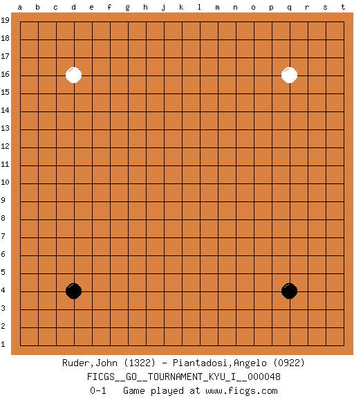Last move : 0-1 2013 July 31 16:37:45 [Event "FICGS__GO__TOURNAMENT_KYU_I__000048"] [Site "FICGS"] [Date "2013.06.28"] [Round "1"] [Black "Ruder,John"] [White "Piantadosi,Angelo"] [Result "0-1"] [Rating 1 "1322"] [Rating 2 "0922"] 1.q4 d16 2.d4 q16 0-1 This go game has been lost on time (started : 2013.06.28 21:55:17) Here are the names of the openings (joseki) played in the four corners : Player White won this Go (weiqi, baduk) game. Follow this game move after move (download)White is always trying to kill a bigger group than black is trying to save. (Anonymous) There will be no order, only chaos. (Sol Robeson in Pi by Darren Aronofsky)