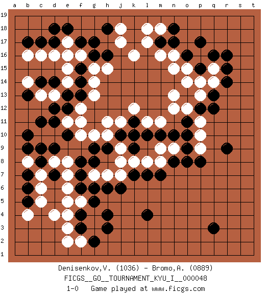 Last move : 1-0 2013 July 7 11:52:33 [Event "FICGS__GO__TOURNAMENT_KYU_I__000048"] [Site "FICGS"] [Date "2013.06.28"] [Round "1"] [Black "Denisenkov,Valentin"] [White "Bromo,Alexis"] [Result "1-0"] [Rating 1 "1036"] [Rating 2 "0889"] 1.q16 d4 2.q3 d16 3.f3 e3 4.f4 e4 5.l4 k16 6.c14 d10 7.f17 k10 8.r9 e15 9.c17 c16 10.d17 e17 11.e18 e16 12.g17 j17 13.c11 c10 14.b10 c9 15.b9 b8 16.e13 g13 17.d11 e11 18.e12 f12 19.e10 f11 20.c8 c7 21.d9 d8 22.c9 f10 23.d7 e8 24.b7 c6 25.b6 c5 26.b5 b4 27.f6 e6 28.f8 e7 29.f7 f5 30.g5 e5 31.h4 j7 32.m17 n15 33.b17 b16 34.o16 n16 35.n17 m16 36.q12 p11 37.p12 o12 38.o13 n13 39.o11 n12 40.o10 p10 41.o9 p9 42.p8 o14 43.o8 p13 44.q13 q14 45.r14 q15 46.r15 p16 47.p15 p14 48.p17 o15 49.r16 l17 50.l7 m8 51.m7 l8 52.k7 k8 53.j6 h7 54.h6 g7 55.g6 f2 56.g2 e2 57.h3 m18 58.n18 l18 59.h18 j18 60.d18 f16 61.m10 n9 62.n10 m11 63.n8 m9 64.l10 l11 65.k11 k12 66.k9 j8 67.j10 j11 68.h9 k10 69.g8 j9 70.k11 h10 71.k10 h11 72.g9 g10 73.g16 g15 74.f14 g14 75.h16 h15 76.f15 e14 77.f13 d13 78.d12 c13 79.b13 b14 80.d14 1-0 Here are the names of the openings (joseki) played in the four corners : Corner d4 : d4 f3 Hoshi (Hwajeom, Seongjeom, Xingwei`) 4-4 Point. The star or hoshi (4-4) point, emphasizing influence at the potential expense of territory. Ikken Kakari (Hankan Keolch'im, Yi Gua`jiao~, 1-Space Low Approach). Black 2 is the standard approach move to the 4-4. Corner d16 : d16 c14 Hoshi (Hwajeom, Seongjeom, Xingwei`) 4-4 Point. The star or hoshi (4-4) point, emphasizing influence at the potential expense of territory. Ikken Kakari (Hankan Keolch'im, Yi Gua`jiao~, 1-Space Low Approach). Black 2 is the standard approach move to the 4-4. Player Black won this Go (weiqi, baduk) game. Follow this game move after move (download)The carpenter's square becomes ko. (Anonymous) The general who wins the battle makes many calculations in his temple before the battle is fought. The general who loses makes but few calculations beforehand. (Sun Tzu)