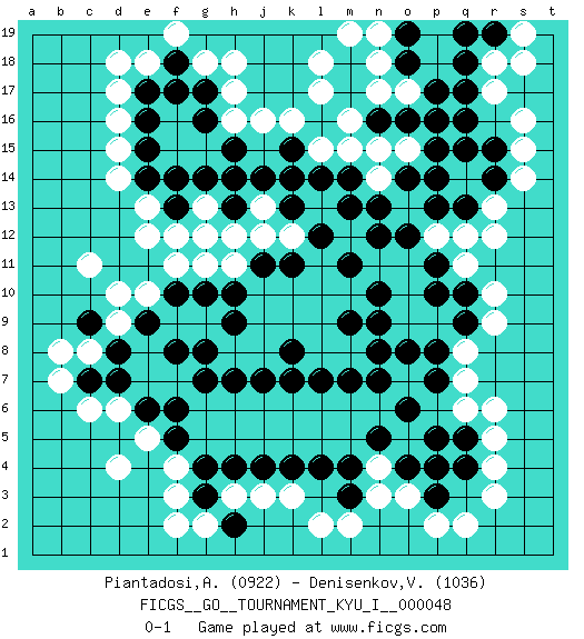 Last move : 0-1 2013 October 28 0:25:57 [Event "FICGS__GO__TOURNAMENT_KYU_I__000048"] [Site "FICGS"] [Date "2013.06.28"] [Round "1"] [Black "Piantadosi,Angelo"] [White "Denisenkov,Valentin"] [Result "0-1"] [Rating 1 "0922"] [Rating 2 "1036"] 1.q16 d4 2.q4 d17 3.q10 o17 4.m17 o15 5.p15 n14 6.l14 m16 7.n16 n17 8.o16 n15 9.p16 l17 10.m18 l18 11.n12 l15 12.k15 o3 13.m3 k3 14.l4 o5 15.p5 q2 16.p3 p2 17.o4 n4 18.p4 n3 19.k4 m2 20.m4 l2 21.g3 c11 22.f6 d6 23.f8 q8 24.n5 o7 25.o6 r6 26.p7 q7 27.o8 r4 28.n7 r3 29.d8 c8 30.c9 d9 31.e9 d10 32.c7 b8 33.d7 c6 34.e6 b7 35.g14 g11 36.g10 f12 37.f13 e13 38.g12 f11 39.f10 h11 40.k11 j10 41.k8 h12 42.h13 j13 43.j14 k12 44.k13 j12 45.e14 d14 46.e15 d15 47.e16 d16 48.e17 g13 49.f14 h14 50.h15 l13 51.k14 h17 52.p17 n18 53.m14 m15 54.n13 k16 55.l12 l11 56.m13 k10 57.m11 l10 58.m9 m10 59.n10 j8 60.j7 h8 61.h7 l8 62.l7 k9 63.k7 m8 64.n9 l9 65.g8 r13 66.q13 q14 67.p14 q12 68.p13 r12 69.p11 r10 70.q9 r9 71.p8 s15 72.r14 s14 73.q15 r17 74.o18 m19 75.o19 n19 76.q18 r18 77.r19 s16 78.q17 s19 79.q19 s18 80.r15 j3 81.h4 f4 82.g4 f3 83.f5 e5 84.h9 j9 85.g7 g2 86.h2 f2 87.h13 h3 88.j4 e18 89.f18 d18 90.o14 g18 91.g17 f19 92.f17 h18 93.h14 e10 94.h10 p12 95.o12 q11 96.p10 q6 97.m7 h16 98.g16 j16 99.n8 e12 100.j11 g12 101.q5 r5 0-1 Here are the names of the openings (joseki) played in the four corners : Corner q16 : q16 o17 Hoshi (Hwajeom, Seongjeom, Xingwei`) 4-4 Point. The star or hoshi (4-4) point, emphasizing influence at the potential expense of territory. Ikken Kakari (Hankan Keolch'im, Yi Gua`jiao~, 1-Space Low Approach). White 2 is the standard approach move to the 4-4. Corner q4 : q4 o3 Hoshi (Hwajeom, Seongjeom, Xingwei`) 4-4 Point. The star or hoshi (4-4) point, emphasizing influence at the potential expense of territory. Ikken Kakari (Hankan Keolch'im, Yi Gua`jiao~, 1-Space Low Approach). White 2 is the standard approach move to the 4-4. Corner d4 : d4 g3 Hoshi (Hwajeom, Seongjeom, Xingwei`) 4-4 Point. The star or hoshi (4-4) point, emphasizing influence at the potential expense of territory. Niken Kakari (Dukan Keolch'im, E`r Gua`jiao~, 2-Space Low Approach). White typically answers by 7-3 or 3-5 (which is not joseki). Player White won this Go (weiqi, baduk) game. Follow this game move after move (download)There are players who don't accept exchange: they play many moves that perpetuate a previous state of the game. (Pierre Audouard) I don't know, I don't care, and it doesn't make any difference. (Albert Einstein)