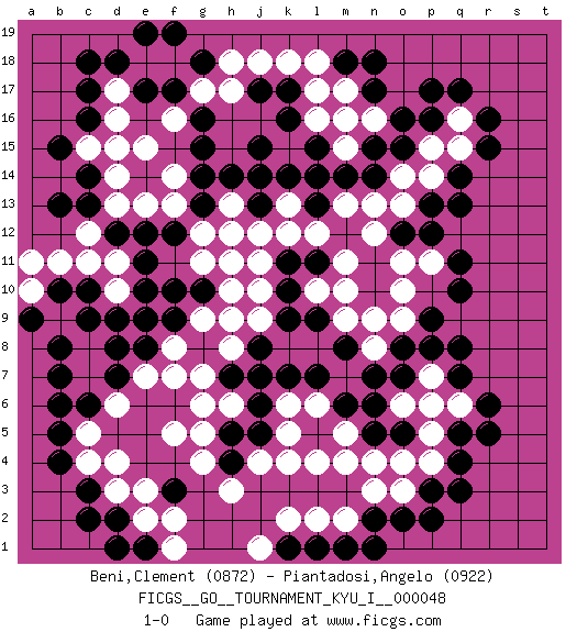 Last move : 1-0 2013 December 8 2:18:9 [Event "FICGS__GO__TOURNAMENT_KYU_I__000048"] [Site "FICGS"] [Date "2013.06.28"] [Round "1"] [Black "Beni,Clement"] [White "Piantadosi,Angelo"] [Result "1-0"] [Rating 1 "0872"] [Rating 2 "0922"] 1.r16 d4 2.q3 d16 3.p17 d10 4.r5 k4 5.f17 h17 6.c14 e15 7.c17 d17 8.c16 c15 9.b15 d15 10.d18 e18 11.c18 m16 12.e17 f18 13.g18 g17 14.f19 f16 15.e19 h18 16.q10 p15 17.q14 q15 18.r15 p14 19.k10 m13 20.f3 f5 21.c3 d3 22.d2 e2 23.c2 e3 24.b6 c4 25.b4 c5 26.b5 n3 27.e1 f1 28.d1 f2 29.d7 c7 30.c6 d6 31.n5 m5 32.m6 l6 33.n6 n4 34.p13 o13 35.q13 o10 36.l7 k6 37.m8 m10 38.k7 j7 39.p9 o9 40.q8 e7 41.d8 c8 42.j8 k12 43.l5 m4 44.j6 k5 45.h7 h6 46.j5 j4 47.h5 g6 48.e8 f7 49.c9 b9 50.c10 f8 51.d9 c11 52.b10 e9 53.e10 d11 54.f9 g9 55.g10 h9 56.e11 b11 57.b8 a10 58.a9 a11 59.e12 d13 60.d12 c12 61.c13 d14 62.b13 j9 63.g13 h11 64.g15 f14 65.g14 g12 66.g16 f13 67.f12 g11 68.b7 g4 69.o2 o3 70.p2 p5 71.o8 q6 72.r6 p4 73.o12 n12 74.p12 o11 75.l1 l2 76.m1 m2 77.k1 j1 78.n1 k2 79.m18 l18 80.n18 m17 81.p16 p11 82.q11 m9 83.l9 l10 84.k9 h10 85.q7 p7 86.o7 o6 87.o15 o14 88.n15 m15 89.n14 n13 90.m14 l14 91.n17 n16 92.o16 q16 93.q17 p6 94.p8 n8 95.n7 n9 96.l15 k15 97.l13 l12 98.k14 l16 99.l14 j14 100.k16 l17 101.k17 k18 102.j15 k13 103.j17 j18 104.j13 h13 105.h14 h12 106.h4 h3 107.q4 g5 108.j7 g7 109.k11 j12 110.l11 m11 111.f10 h8 112.n2 e13 113.o5 l4 114.p3 o4 115.q5 j11 116.j14 j10 117.e9 1-0 Here are the names of the openings (joseki) played in the four corners : Corner d16 : d16 f17 Hoshi (Hwajeom, Seongjeom, Xingwei`) 4-4 Point. The star or hoshi (4-4) point, emphasizing influence at the potential expense of territory. Ikken Kakari (Hankan Keolch'im, Yi Gua`jiao~, 1-Space Low Approach). Black 2 is the standard approach move to the 4-4. Corner d4 : d4 f3 Hoshi (Hwajeom, Seongjeom, Xingwei`) 4-4 Point. The star or hoshi (4-4) point, emphasizing influence at the potential expense of territory. Ikken Kakari (Hankan Keolch'im, Yi Gua`jiao~, 1-Space Low Approach). Black 2 is the standard approach move to the 4-4. Player Black won this Go (weiqi, baduk) game. Follow this game move after move (download)Each step in a ladder is worth 7 points. (Anonymous) All war is based on deception. (Sun Tzu)