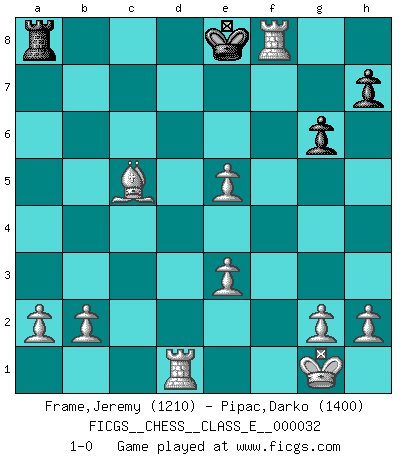 Last move : 1-0 2007 April 5 14:53:48 [Event "FICGS__CHESS__CLASS_E__000032"] [Site "FICGS"] [Date "2007.02.01"] [Round "1"] [White "Frame,Jeremy"] [Black "Pipac,Darko"] [Result "1-0"] [WhiteElo "1210"] [BlackElo "1400"] 1.e4 e5 2.Nf3 Nc6 3.Bc4 Nf6 4.Nc3 a6 5.Ng5 d5 6.exd5 Nxd5 7.Nxd5 b5 8.Bb3 Be6 9.Nxe6 fxe6 10.Ne3 a5 11.Bxe6 Qf6 12.Bd5 Bc5 13.O-O O-O-O 14.Bxc6 Qxc6 15.d3 e4 16.Qg4+ Rd7 17.dxe4 Bxe3 18.fxe3 Kb8 19.e5 Qxc2 20.Qxd7 g6 21.Qxb5+ Kc8 22.Qxa5 Kd7 23.Qd2+ Qxd2 24.Bxd2 Rd8 25.Rad1 Ke6 26.Bc3 Ra8 27.Rf6+ Ke7 28.Bb4+ c5 29.Bxc5+ Ke8 30.Rf8+ 1-0 Two knights defense Kingside Castling by player White (move 13) Queenside Castling by player Black (move 13) Player White won this chess game. Follow this game move after move (download)Chess mastery essentially consists of analyzing Chess positions accurately. (Mikhail Botvinnik) Obwohl ich alt bin, darf mir niemand den Finger in den Mund stecken, sonst beisse ich. (Wilhelm Steinitz) Todavía soy una víctima del Ajedrez. Tiene toda la belleza del arte y mucho mas. No puede ser comercializado. El Ajedrez es mas puro que el arte en su posición social. (Marcel Duchamp) J'apprécie les joueurs d'est-indienne, c'est grâce à eux que je nourris ma famille depuis tant d'années. (Petrosian) Fortune favours the audacious. (Desiderius Erasmus)