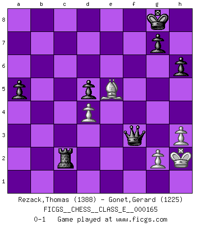Last move : 0-1 2013 September 2 12:38:4 [Event "FICGS__CHESS__CLASS_E__000165"] [Site "FICGS"] [Date "2013.06.29"] [Round "1"] [White "Rezack,Thomas"] [Black "Gonet,Gerard"] [Result "0-1"] [WhiteElo "1388"] [BlackElo "1225"] 1.e4 e5 2.Nf3 f5 3.Nxe5 Qf6 4.d4 d6 5.Nf3 fxe4 6.Bg5 Qf7 7.Bb5+ c6 8.Qe2 cxb5 9.Qxe4+ Be7 10.O-O Nf6 11.Qe2 O-O 12.Re1 Re8 13.Qxb5 a6 14.Qd3 Nc6 15.c3 Qd5 16.Nbd2 Bf5 17.Qf1 h6 18.Be3 b5 19.b3 Bg4 20.h3 Bd7 21.Rab1 Bf5 22.c4 bxc4 23.Nxc4 Bxb1 24.Rxb1 Nb4 25.Rb2 Ne4 26.Nb6 Qb7 27.a3 Qxb6 28.axb4 Qxb4 29.Qe2 Rec8 30.Ne1 d5 31.Nd3 Qc3 32.Ne5 Rab8 33.Ng6 Bf6 34.Bf4 Rxb3 35.Rxb3 Qxb3 36.Ne5 a5 37.f3 Ng5 38.Kh2 Rc2 39.Qf1 Bxe5 40.Bxe5 Nxf3+ 41.Qxf3 Qxf3 0-1 Latvian counter-gambit Kingside Castling by player White (move 10) Kingside Castling by player Black (move 11) Player Black won this chess game. Follow this game move after move (download)A man without frontiers. He didn't divide the East and the West, he brought them together in their admiration for him. (Ljubomir Ljubojevic, about Bobby Fischer's death) Ich organisiere ein großes Turnier, was mich etwa 120000 Dollar kostet. Ich denke, das ist das erste Mal in der Schachgeschichte, daß ein Schachgroßmeister auch als Mäzen auftritt. (Miguel Najdorf) EL Ajedrez es como la vida. (Boris Spassky) J'ai toujours senti une vague pitié pour l'homme qui ne connaît rien aux échecs, tout comme j'en aurais pour un homme ignorant de l'amour. Les Echecs, comme la musique ou comme l'amour, ont le pouvoir de rendre heureux. (Siegbert Tarrasch) As a goal marker shodan is important. As a destination it is a poor place to stop. (Thomas Tamayo)
