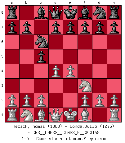 Last move : 1-0 2013 August 11 6:6:33 [Event "FICGS__CHESS__CLASS_E__000165"] [Site "FICGS"] [Date "2013.06.29"] [Round "1"] [White "Rezack,Thomas"] [Black "Conde,Julio"] [Result "1-0"] [WhiteElo "1388"] [BlackElo "1276"] 1.e4 c5 2.Nf3 Nc6 3.d4 1-0 This chess game has been lost on time (started : 2013.06.29 8:5:26) Sicilian defense Player White won this chess game. Follow this game move after move (download)During a Chess competition a Chessmaster should be a combination of a beast of prey and a monk. (Alexander Alekhine) Wenn man heute mit 14 Jahren noch kein GM ist, kann man es vergessen. (Viswanathan Anand) Cuando no sepas que mover, espera por una idea que se le venga a la la cabeza de tu oponente. Tenlo por seguro de que esa idea estará incorrecta. (Siegbert Tarrasch) Les sacrifices démontrent seulement que quelqu'un a gaffé. (Savielly Tartacover) The human is the only animal species whose members are able to talk themselves into difficulties that would not otherwise exist. (Wendell Johnson)