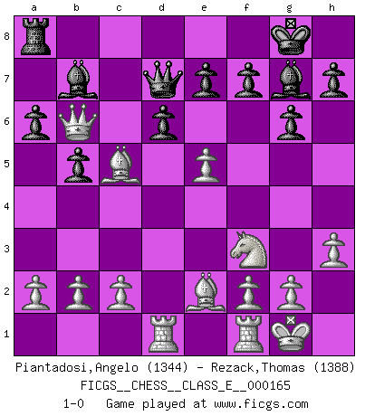 Last move : 1-0 2013 August 12 12:59:35 [Event "FICGS__CHESS__CLASS_E__000165"] [Site "FICGS"] [Date "2013.06.29"] [Round "1"] [White "Piantadosi,Angelo"] [Black "Rezack,Thomas"] [Result "1-0"] [WhiteElo "1344"] [BlackElo "1388"] 1.e4 d6 2.d4 Nf6 3.Nc3 g6 4.Nf3 Bg7 5.Be2 Nbd7 6.O-O O-O 7.h3 a6 8.Be3 Qe8 9.Qd2 c5 10.Rad1 b5 11.dxc5 Nxc5 12.e5 Nfe4 13.Nxe4 Nxe4 14.Qd5 Nc5 15.Qxa8 Qd7 16.Bxc5 Bb7 17.Qa7 Ra8 18.Qb6 1-0 Pirc : Classical system, 5.Be2 Kingside Castling by player White (move 6) Kingside Castling by player Black (move 6) Player White won this chess game. Follow this game move after move (download)The way he plays Chess demonstrates a man's whole nature. (Stanley Ellin) Wenn du gegen Bobby spielst, ist es keine Frage von gewinnen oder verlieren. Es ist eine Frage des Überlebens. (Boris Vassilievich Spassky) Los libros de Ajedrez deben de usarse igual como usamos los anteojos: para mejorar la vista, aunque algunos jugadores los quieren usar como si ellos les otorgaran la vision. (José Raúl Capablanca) Toutes choses étant égales, c'est la conviction qui gagne. Alliée à une volonté de vaincre, elle sert de détonateur, suscite des idées, disperse les doutes et aide à penser clairement. (Robert Fischer) May the force be with you. (Han Solo in Star Wars ep.4)