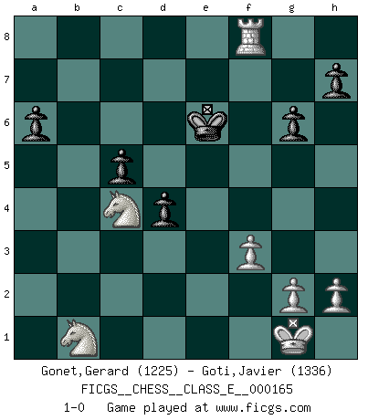 Last move : 1-0 2013 July 16 11:10:41 [Event "FICGS__CHESS__CLASS_E__000165"] [Site "FICGS"] [Date "2013.06.29"] [Round "1"] [White "Gonet,Gerard"] [Black "Goti,Javier"] [Result "1-0"] [WhiteElo "1225"] [BlackElo "1336"] 1.d4 Nf6 2.f3 g6 3.e4 d6 4.c4 Bg7 5.Nc3 O-O 6.Be3 Re8 7.Bd3 Nc6 8.Nge2 Nd7 9.a3 e5 10.O-O Nxd4 11.Bxd4 exd4 12.Nb5 Nc5 13.b4 Nxd3 14.Qxd3 c5 15.bxc5 dxc5 16.a4 a6 17.Na3 f5 18.Rae1 Rb8 19.Nf4 Qa5 20.Qd1 fxe4 21.Rxe4 Bd7 22.Rfe1 Bxa4 23.Rxe8+ Bxe8 24.Nb1 b5 25.Qe2 Bf7 26.Nd5 bxc4 27.Ne7+ Kh8 28.Nc6 Re8 29.Qxe8+ Bxe8 30.Rxe8+ Bf8 31.Nxa5 Kg8 32.Nxc4 Kf7 33.Ra8 Ke6 34.Rxf8 1-0 Paleface attack Kingside Castling by player Black (move 5) Kingside Castling by player White (move 10) Player White won this chess game. Follow this game move after move (download)No price is too great for the scalp of the enemy King. (Koblentz) Jeder weiß, dass Gasprom Putins persönliches Machtinstrument ist. Die Firma wird vom Kreml aus geleitet und wird schon deshalb nie transparent sein. (Garry Kasparov) Las Aperturas te enseñan aperturas. ¡Los Finales te enseñan Ajedrez!. (Stephan Gerzadowicz) Je menace de comprendre la position. (Anonyme) Perhaps chess is the wrong game for the times (The Chess Master and the Computer, by Garry Kasparov - 2010)