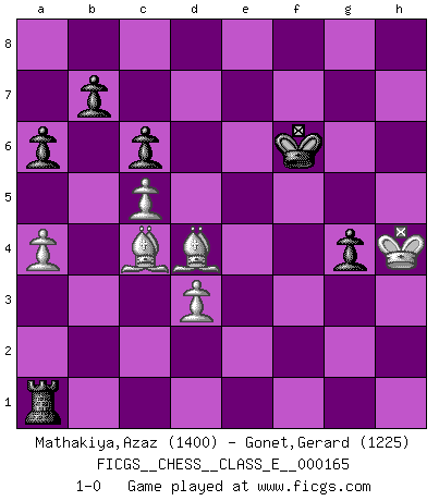 Last move : 1-0 2013 July 27 13:25:14 [Event "FICGS__CHESS__CLASS_E__000165"] [Site "FICGS"] [Date "2013.06.29"] [Round "1"] [White "Mathakiya,Azaz"] [Black "Gonet,Gerard"] [Result "1-0"] [WhiteElo "1400"] [BlackElo "1225"] 1.e4 e5 2.Nf3 f5 3.Nxe5 Qf6 4.Nc4 fxe4 5.Qh5 g6 6.Qe5 Qxe5 7.Nxe5 Nf6 8.Bc4 d5 9.Be2 Nbd7 10.Nxd7 Bxd7 11.d3 O-O-O 12.Bg5 Bg7 13.Nc3 Bc6 14.f3 Rde8 15.O-O-O exf3 16.Bxf3 Re5 17.h4 Nd7 18.Rhe1 Rxe1 19.Rxe1 Bxc3 20.bxc3 Nc5 21.h5 Na4 22.hxg6 hxg6 23.Bf6 Rf8 24.Bg4 Kb8 25.Re6 Bd7 26.Re8 Rxe8 27.Bxd7 Re1+ 28.Kd2 Rg1 29.Bxa4 Rxg2+ 30.Ke3 g5 31.Bd4 g4 32.Kf4 a6 33.c4 c6 34.c5 Kc7 35.Bb3 Kd7 36.c4 dxc4 37.Bxc4 Kc7 38.a4 Kd7 39.Be3 Ke7 40.Kg5 Rg3 41.Bf4 Rg1 42.Kh4 Kf6 43.Be3 Ra1 44.Bd4 1-0 Latvian counter-gambit Queenside Castling by player Black (move 11) Queenside Castling by player White (move 15) Player White won this chess game. Follow this game move after move (download)A strong memory, concentration, imagination, and a strong will is required to become a great Chess player. (Bobby Fischer) Vielleicht wirkt die Aura früherer Spieler glanzvoller als die der heutigen Spieler, aber das liegt daran, dass man kein Programm wie Fritz hatte, das einem all die Löcher in ihren Partien zeigt. (Vladimir Kramnik) Jugadores de primera clase pierden en contra de jugadores de segunda clase porque los jugadores de segunda clase a veces juegan una partida de primer clase. (Siegbert Tarrasch) Les Echecs mettent en conflit, non pas deux intelligences, mais deux volontés. (Lasker) To err is human, to shift the blame on someone else is tactical. (Mladen Jankovic)