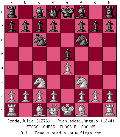 Last move : 0-1 2013 August 10 5:55:15 [Event "FICGS__CHESS__CLASS_E__000165"] [Site "FICGS"] [Date "2013.06.29"] [Round "1"] [White "Conde,Julio"] [Black "Piantadosi,Angelo"] [Result "0-1"] [WhiteElo "1276"] [BlackElo "1344"] 1.e4 e5 2.Nf3 Nf6 3.Nc3 Nc6 0-1 This chess game has been lost on time (started : 2013.06.29 8:5:26) Petrov Three knights game Player Black won this chess game. Follow this game move after move (download)Suddenly it was obvious to me in my analysis I had missed what Fischer had found with the greatest of ease at the board. (Mikhail Botvinnik) Der Knackpunkt bei der Konzentration ist, daß wir nur durch sie etwas Neues und Ungewöhnliches am Schachbrett finden können. Sie ist der einzige Weg durch neue neue Ideen eine Überraschung zu bereiten. (Garry Kasparov) ¡Examina movidas que hagan daño! Un buen ojo for movidas desvastantes es mucho mas importante que el conocimiento de principios estratégicos. (Purdy) Dieu déplace le joueur, et celui-ci la pièce. Quel Dieu derrière Dieu commence donc la trame ? Arturo Perez-Reverte (prix de littérature policière 1993). He who is a good ruler must first have been ruled. (Aristotle)