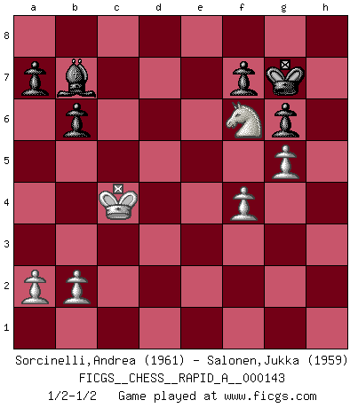Last move : 1/2-1/2 2013 September 3 13:19:53 [Event "FICGS__CHESS__RAPID_A__000143"] [Site "FICGS"] [Date "2013.06.29"] [Round "1"] [White "Sorcinelli,Andrea"] [Black "Salonen,Jukka"] [Result "1/2-1/2"] [WhiteElo "1961"] [BlackElo "1959"] 1.d4 d5 2.c4 e6 3.Nc3 Nf6 4.cxd5 exd5 5.Bg5 Be7 6.Qc2 c6 7.e3 O-O 8.Bd3 Nbd7 9.Nf3 Re8 10.h3 Nf8 11.Bf4 Bd6 12.Bxd6 Qxd6 13.O-O-O Ne6 14.g4 g6 15.Kb1 c5 16.dxc5 Nxc5 17.e4 Qf4 18.Nxd5 Nxd5 19.exd5 Nxd3 20.Rxd3 h5 21.Nh2 hxg4 22.hxg4 b6 23.d6 Ba6 24.d7 Red8 25.Rh3 Bb7 26.f3 Rxd7 27.g5 Qf5 28.Ng4 Qxc2+ 29.Kxc2 Kg7 30.Nf6 Rc8+ 31.Kb3 R7d8 32.Kb4 Rh8 33.Rxh8 Rxh8 34.Rxh8 Kxh8 35.f4 Kg7 36.Kc4 1/2-1/2 QGD : Exchange, positional line Kingside Castling by player Black (move 7) Queenside Castling by player White (move 13) This chess game ended in a draw. Follow this game move after move (download)You must take your opponent into a deep dark forest where 2+2=5, and the path leading out is only wide enough for one. (Mikhail Tal) Schach ist das Spiel, das die Verrückten gesund hält. (Albert Einstein) Juega la Apertura como un libro, el Juego Medio como un mago y los Finales como una máquina. (Spielmann) Pour moi, les échecs ne sont pas un jeu mais un art. (Alexandre Alekhine) Every vice is only an exaggeration of a necessary and virtuous function. (Ralph Waldo Emerson, Journals 1936)