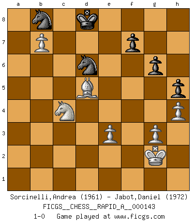 Last move : 1-0 2013 October 28 9:56:34 [Event "FICGS__CHESS__RAPID_A__000143"] [Site "FICGS"] [Date "2013.06.29"] [Round "1"] [White "Sorcinelli,Andrea"] [Black "Jabot,Daniel"] [Result "1-0"] [WhiteElo "1961"] [BlackElo "1972"] 1.d4 Nf6 2.c4 g6 3.Nc3 Bg7 4.e4 d6 5.Nf3 c6 6.Be2 Bg4 7.Be3 O-O 8.O-O Qc7 9.h3 Bxf3 10.Bxf3 Nbd7 11.Rc1 Rfe8 12.Qc2 Rec8 13.Rfd1 e6 14.Be2 Ne8 15.a3 a6 16.b4 a5 17.Qd2 axb4 18.axb4 Ra3 19.d5 Nf8 20.c5 exd5 21.exd5 dxc5 22.Ne4 Qe7 23.Bf3 cxd5 24.Qxd5 c4 25.Rxc4 Rxc4 26.Qxc4 Ra1 27.Rxa1 Bxa1 28.b5 Ne6 29.Qd5 Bb2 30.b6 Ba3 31.g3 h5 32.h4 Kf8 33.Nc3 Bc5 34.Qxb7 Qxb7 35.Bxb7 Bxe3 36.fxe3 Nc5 37.Bd5 Nd7 38.b7 Ke7 39.Kg2 Nd6 40.Na4 Nb8 41.Nb6 Kd8 42.Nc4 1-0 King's Indian : 5.Nf3 Kingside Castling by player Black (move 7) Kingside Castling by player White (move 8) Player White won this chess game. Follow this game move after move (download)In Chess, as it is played by masters, chance is practically eliminated. (Emanuel Lasker) Ich bin der einzige Schachspieler, der sich während der Vorbereitungen zum Turnier verletzt hat. (Woody Allen) El Ajedrez es el juego mas altamente simbólico, pero las agresiones estan por lo tanto aún mas francamente representadas en la partida. Tal vez comenzo como un juego de guerra; Algo como la representación de una batalla en miniatura entre las fuerzas de dos reinos. (Karl Meninger) Votre prénom est 'Tactique', votre deuxième prénom est 'Tactique' et votre nom est 'Tactique'. (Ken Smith) Ah, the Socrating method. The best way we have of teaching everything-apart from juggling chainsaws. (Gregory House, House M.D.)