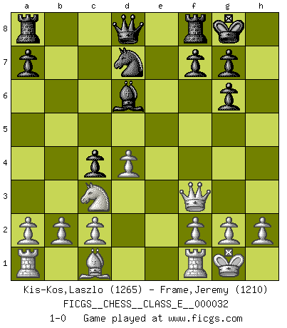 Last move : 1-0 2007 March 15 17:45:22 [Event "FICGS__CHESS__CLASS_E__000032"] [Site "FICGS"] [Date "2007.02.01"] [Round "1"] [White "Kis-Kos,Laszlo"] [Black "Frame,Jeremy"] [Result "1-0"] [WhiteElo "1265"] [BlackElo "1210"] 1.e4 e5 2.Nf3 Nf6 3.Nxe5 d6 4.Nf3 Nxe4 5.d4 d5 6.Bd3 Bf5 7.O-O c5 8.Ne5 c4 9.Bxe4 Bxe4 10.Nc3 Bg6 11.Qf3 Bd6 12.Qxd5 O-O 13.Nxg6 hxg6 14.Qxb7 Nd7 15.Qf3 1-0 Petrov : Classical attack Kingside Castling by player White (move 7) Kingside Castling by player Black (move 12) Player White won this chess game. Follow this game move after move (download)Chess is a fairy tale of 1001 blunders. (Savielly Tartakower) Wenn Du einsam bist, wenn Du Dich in der Welt wie ein Fremder fühlst, spiele Schach. Das wird Deinen Geist erheben und Dein Ratgeber im Kampf sein. (Aristoteles) La enorme capacidad mental, en la que sin ella no puede un jugador de Ajedrez existir, es demasiado requerida por el Ajedrez al grado de que nunca podrá liberar su mente de este juego. (Albert Einstein) Votre seul travail dans les ouvertures est d'obtenir un milieu de partie jouable. (Lajos Portish) The absolute truth is the thing that makes people laugh. (Carl Reiner)