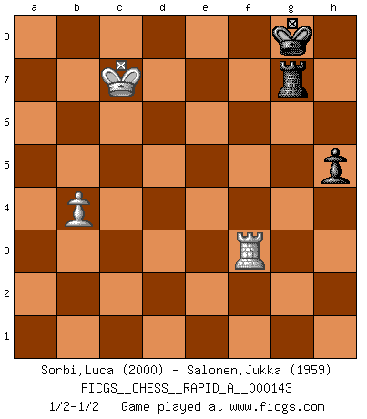 Last move : 1/2-1/2 2013 August 29 15:18:40 [Event "FICGS__CHESS__RAPID_A__000143"] [Site "FICGS"] [Date "2013.06.29"] [Round "1"] [White "Sorbi,Luca"] [Black "Salonen,Jukka"] [Result "1/2-1/2"] [WhiteElo "2000"] [BlackElo "1959"] 1.e4 c5 2.Nf3 d6 3.d4 cxd4 4.Nxd4 Nf6 5.Nc3 Nc6 6.Bg5 e6 7.Qd2 a6 8.O-O-O Be7 9.f4 Nxd4 10.Qxd4 O-O 11.Be2 b5 12.Bf3 Bb7 13.e5 Bxf3 14.exf6 gxf6 15.gxf3 fxg5 16.Ne4 d5 17.Nxg5 Bf6 18.Qd3 Bxg5 19.Rhg1 Qf6 20.fxg5 Qg6 21.f4 Qxd3 22.Rxd3 Rac8 23.f5 Rc4 24.Re1 Rfc8 25.c3 Re4 26.Kd2 Rxe1 27.Kxe1 Rc4 28.fxe6 fxe6 29.Rh3 b4 30.cxb4 Rxb4 31.b3 Rb6 32.Rh6 Rc6 33.h4 a5 34.Kd2 a4 35.Rf6 axb3 36.axb3 Rb6 37.Kc3 Rc6+ 38.Kd4 Rb6 39.Rf3 Rb4+ 40.Ke5 Rxh4 41.Kxe6 Rg4 42.Kxd5 Rxg5+ 43.Kc6 h5 44.b4 Rg6+ 45.Kc7 Rg7+ 1/2-1/2 Sicilian : Richter-Rauzer, Rauzer attack, 7...a6 Queenside Castling by player White (move 8) Kingside Castling by player Black (move 10) 10 pieces endgame at move 36 : White KRPPP , Black KRPPP WHITE : King + 1 Rook 3 Pawns BLACK : King + 1 Rook 3 Pawns 9 pieces endgame at move 40 : White KRPP , Black KRPPP WHITE : King + 1 Rook 2 Pawns BLACK : King + 1 Rook 3 Pawns 8 pieces endgame at move 41 : White KRPP , Black KRPP WHITE : King + 1 Rook 2 Pawns BLACK : King + 1 Rook 2 Pawns 7 pieces endgame at move 42 : White KRPP , Black KRP WHITE : King + 1 Rook 2 Pawns BLACK : King + 1 Rook 1 Pawn 6 pieces endgame at move 42 : White KRP , Black KRP WHITE : King + 1 Rook 1 Pawn BLACK : King + 1 Rook 1 Pawn This chess game ended in a draw. Follow this game move after move (download)I won't play with you anymore. You have insulted my friend. - When an opponent cursed himself for a blunder. (Miguel Najdorf) Ja, ich habe einmal eine Blitzpartie gespielt, es war in einem Zug, 1929. --im Interview 1989 (Mikhail Moiseyevich Botvinik) Yo no creo en la psicología. Yo creo en las buenas movidas. (Bobby Fischer) Même si vous avez un bon coup à faire, regardez toujours s'il n'y en a pas un qui lui soit préférable. (Pedro Damiano) 'preceded by its own quotation yields a falsehood' preceded by its own quotation yields a falsehood. (W. V. O. Quine - Set Theory And Its Logic, 1953)