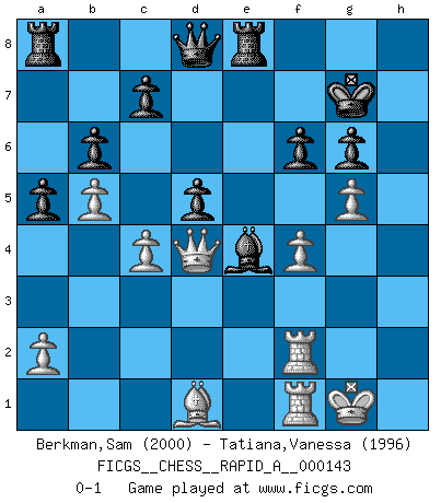 Last move : 0-1 2013 October 22 16:52:40 [Event "FICGS__CHESS__RAPID_A__000143"] [Site "FICGS"] [Date "2013.06.29"] [Round "1"] [White "Berkman,Sam"] [Black "Tatiana,Vanessa"] [Result "0-1"] [WhiteElo "2000"] [BlackElo "1996"] 1.d4 Nf6 2.c4 g6 3.Nc3 Bg7 4.e4 d6 5.Nf3 O-O 6.Be2 e5 7.O-O exd4 8.Nxd4 Nc6 9.Be3 Re8 10.f3 Nh5 11.Qd2 Nxd4 12.Bxd4 Bxd4+ 13.Qxd4 Nf4 14.Rf2 Ne6 15.Qd2 b6 16.Raf1 Bb7 17.Bd1 Nc5 18.b4 Nd7 19.f4 a5 20.b5 f6 21.h4 Kh8 22.h5 Nc5 23.hxg6 hxg6 24.g4 Kg7 25.g5 Nxe4 26.Nxe4 Bxe4 27.Qd4 d5 0-1 This chess game has been lost on time (started : 2013.06.29 14:14:43) King's Indian : Orthodox variation Kingside Castling by player Black (move 5) Kingside Castling by player White (move 7) Player Black won this chess game. Follow this game move after move (download)The combination player thinks forward; he starts from the given position, and tries the forceful moves in his mind. (Emanuel Lasker) Ich verachte die Medien. (Robert James Fischer) Morphy probablemente fue el genio más grande de todos. (Bobby Fischer) La guerre est enfant de la passion, la passion est enfant du narcissisme et le narcissisme est l'enfant. (...) Une autre partie ? (Thibault de Vassal) The large trees attract high winds. (Chinese proverb)