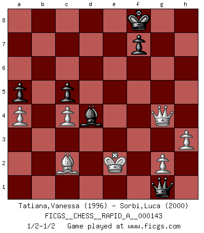 Last move : 1/2-1/2 2013 September 30 19:13:33 [Event "FICGS__CHESS__RAPID_A__000143"] [Site "FICGS"] [Date "2013.06.29"] [Round "1"] [White "Tatiana,Vanessa"] [Black "Sorbi,Luca"] [Result "1/2-1/2"] [WhiteElo "1996"] [BlackElo "2000"] 1.e4 c5 2.Nf3 d6 3.d4 cxd4 4.Nxd4 Nf6 5.Nc3 a6 6.Be3 e5 7.Nb3 Be6 8.Be2 Be7 9.Qd3 O-O 10.O-O Nbd7 11.Nd5 Bxd5 12.exd5 Nc5 13.Nxc5 dxc5 14.Bf3 Bd6 15.Bg5 h6 16.Bh4 g6 17.c4 Qe7 18.Rfe1 Rfe8 19.b3 Rad8 20.Re2 b5 21.Rae1 bxc4 22.bxc4 Rb8 23.h3 Rb4 24.a3 Rb6 25.Be4 Bb8 26.f4 Qd7 27.Bf3 e4 28.Bxe4 Bxf4 29.Bxf6 Rxf6 30.Bxg6 Rxe2 31.Bh7+ Kg7 32.Rxe2 Bc7 33.Be4 h5 34.Bf3 Qd6 35.Kf1 Rf4 36.Qc3+ Rd4 37.Re4 Qf6 38.Rxd4 Be5 39.Qd3 Bxd4 40.Ke1 Bg1 41.d6 Bd4 42.d7 Qe6+ 43.Kd1 Qxd7 44.Bxh5 a5 45.Bf3 Qa4+ 46.Kc1 Qe8 47.Be4 Qb8 48.Kd1 Qb2 49.Qg3+ Kf8 50.Qd3 Kg7 51.Qg3+ Kf8 52.Bc2 Qa1+ 53.Ke2 Qc1 54.Qb8+ Kg7 55.Qb3 Qf4 56.Qf3 Qc1 57.Qd3 Qf4 58.Kd1 Bb2 59.a4 Kf8 60.Ke2 Bd4 61.Qf3 Qc1 62.Qe4 Qg1 63.Qa8+ Kg7 64.Qf3 Qc1 65.Qe4 Qg1 66.Qg4+ Kf8 67.Qf3 Qc1 68.Qa8+ Kg7 69.Qe4 Qg1 70.Qg4+ Kf8 1/2-1/2 Sicilian : Najdorf, Byrne (English) attack Kingside Castling by player Black (move 9) Kingside Castling by player White (move 10) This chess game ended in a draw. Follow this game move after move (download)Good offense and good defense both begin with good development. (Bruce A. Moon) Wenn Du absolut nicht mehr weißt, was Du tun sollst, dann ist es Zeit für Panik. (John van der Wiel) Bobby solo arroja las piezas y solas caen en las casillas correctas. (Miguel Najdorf ) Les réformistes prétendent que les progrès de la théorie conduiront à la disparition des échecs, et qu'il faut, pour leur rendre vie, en remanier les règles. En réalité, qu'exprime cette affirmation? Le mépris de l'intuition, de l'imagination et de tous les autres éléments qui font des échecs un art. (Alexander Alekhine) There will be no order, only chaos. (Sol Robeson in Pi by Darren Aronofsky)