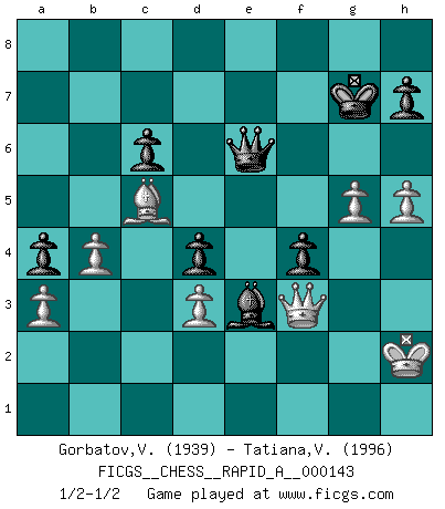 Last move : 1/2-1/2 2013 September 9 1:49:49 [Event "FICGS__CHESS__RAPID_A__000143"] [Site "FICGS"] [Date "2013.06.29"] [Round "1"] [White "Gorbatov,Valentin"] [Black "Tatiana,Vanessa"] [Result "1/2-1/2"] [WhiteElo "1939"] [BlackElo "1996"] 1.e4 c5 2.Nf3 d6 3.d4 cxd4 4.Nxd4 Nf6 5.Nc3 g6 6.Be2 Bg7 7.O-O O-O 8.Be3 Nc6 9.f3 d5 10.Nxc6 bxc6 11.e5 Ne8 12.f4 f6 13.exf6 Bxf6 14.Qd2 Bf5 15.g4 Bd7 16.Bc5 Nd6 17.Qe3 Rf7 18.Rab1 Qc8 19.g5 Bg7 20.Bd3 Bh3 21.Rf3 Bf5 22.Ne2 Qd7 23.Ng3 Bg4 24.Rf2 e5 25.fxe5 Rxf2 26.e6 Bxe6 27.Qxf2 Nf7 28.h4 Ne5 29.Qf4 Bg4 30.Rf1 Re8 31.b4 Bh3 32.Rf2 Nxd3 33.cxd3 Be5 34.Qf3 Bg4 35.Qg2 a6 36.Nf1 Bg7 37.Ne3 Bh3 38.Qg3 d4 39.Nc4 Bf5 40.Nd6 Re1+ 41.Rf1 Re3 42.Rf3 Be5 43.Nxf5 gxf5 44.Qh3 Bf4 45.Rxe3 Bxe3+ 46.Kh2 Qe6 47.Qg3 Kg7 48.a3 Kg6 49.Qf3 a5 50.h5+ Kg7 51.Qg3 f4 52.Qf3 a4 53.Qg2 Qf7 54.Qf3 Qe6 55.Qg2 Qf7 56.Qf3 Qa2+ 57.Kh3 Qe6+ 58.Kh2 1/2-1/2 Sicilian : Dragon variation Kingside Castling by player White (move 7) Kingside Castling by player Black (move 7) This chess game ended in a draw. Follow this game move after move (download)Chess is above all, a fight ! (Emanuel Lasker) Glücklicherweise sind Großmeister Ruben Fines reine Schachbücher weniger phallozentrisch [als seine Schachpsychologie] und deswegen auch weniger lächerlich. (Nigel Short) Buenas posiciones no logran ganar juegos, buenas movidas sí. (Gerald Abrahams) Seul un grand joueur sait à quel point il joue faiblement. (Xavier Tartacover) I'll be back. (Arnold Schwarzenegger)